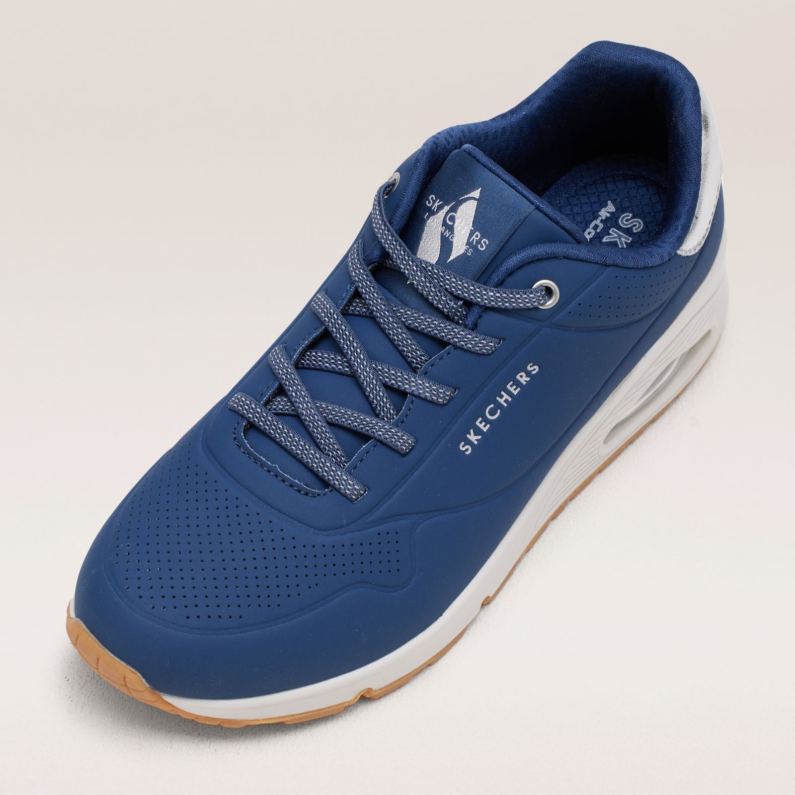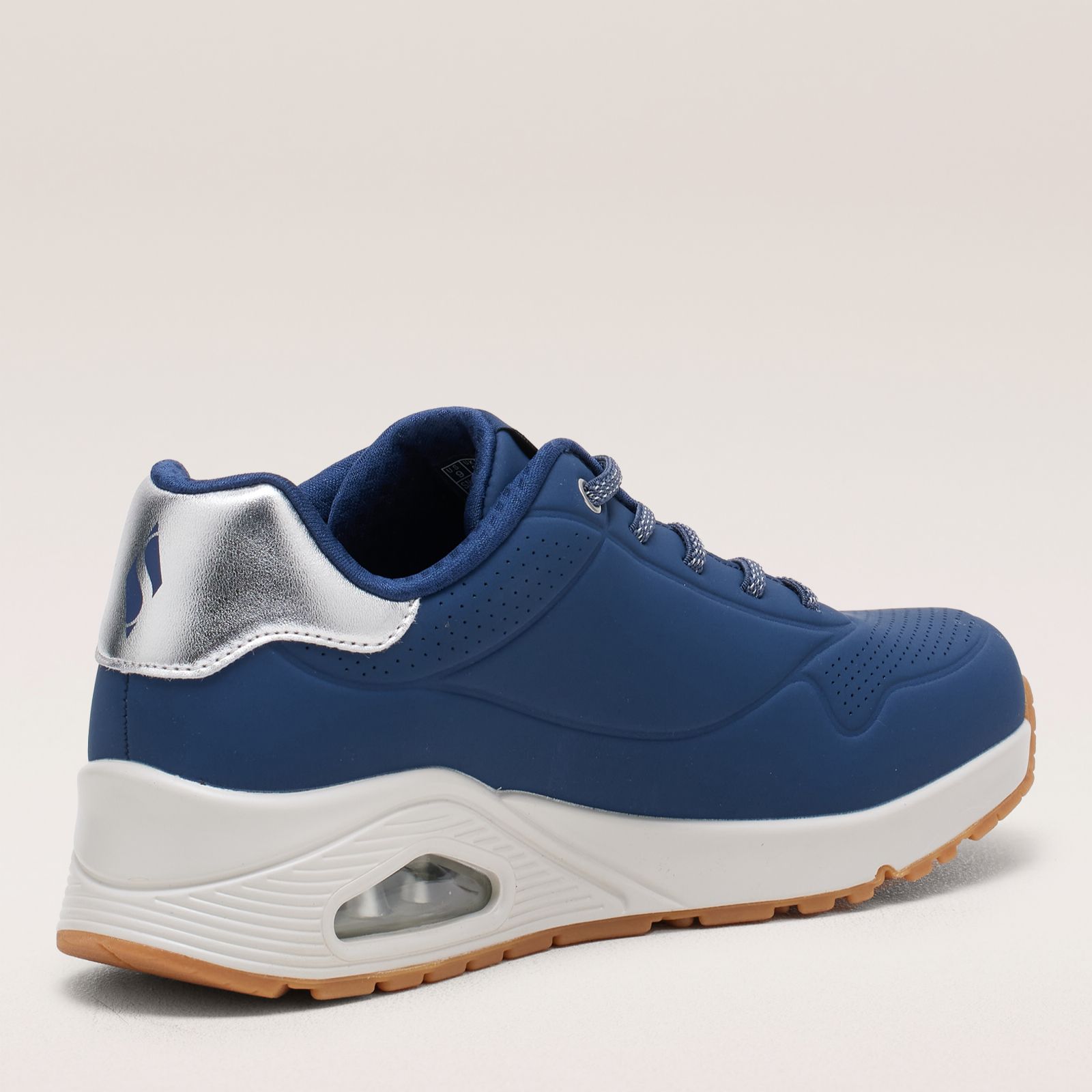Embrace sleek style and ultimate comfort with the Skechers Uno Shimmer Away Slip On Trainer. These trendy trainers boast a durabuck upper with metallic trim and a convenient slip-on design with elastic gore laces for a secure fit. Perfect for casual outings, gym sessions or a day at the park, these trainers offer versatility and flair. Pair them with your favourite athleisure wear or casual jeans for a chic, everyday look.