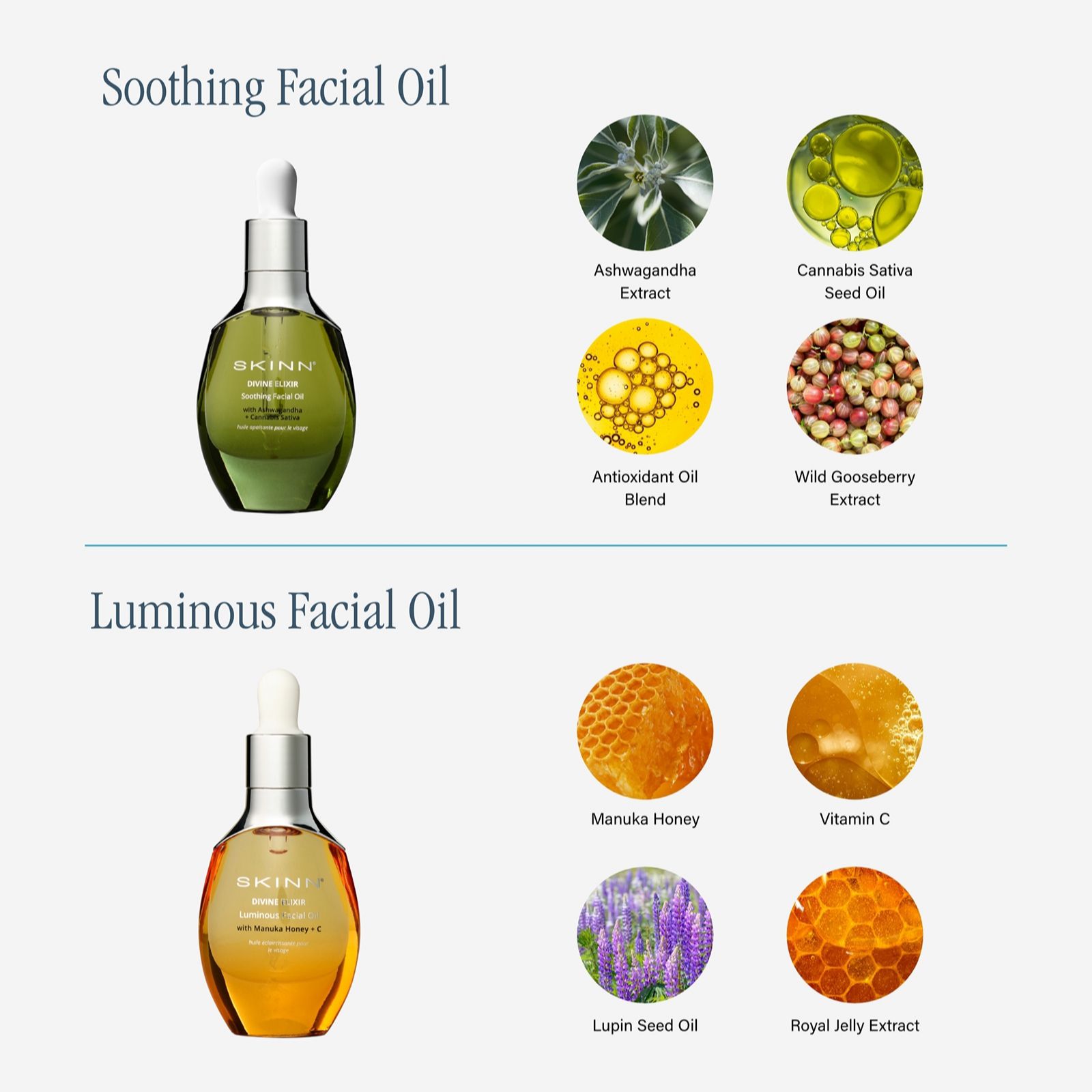 - 1 x Divine Elixir Luminous Facial Oil (15ml) - this brightening formula works to help improve tone, texture and the visible signs of dryness and ageing for skin that's transformed from dull to radiant. Enriched with Meadowfoam Seed, Bilberry Seed, and Sea Buckthorn Oils, along with Manuka Honey, Propolis, Royal Jelly, Pollen Extract, and Vitamins C and E