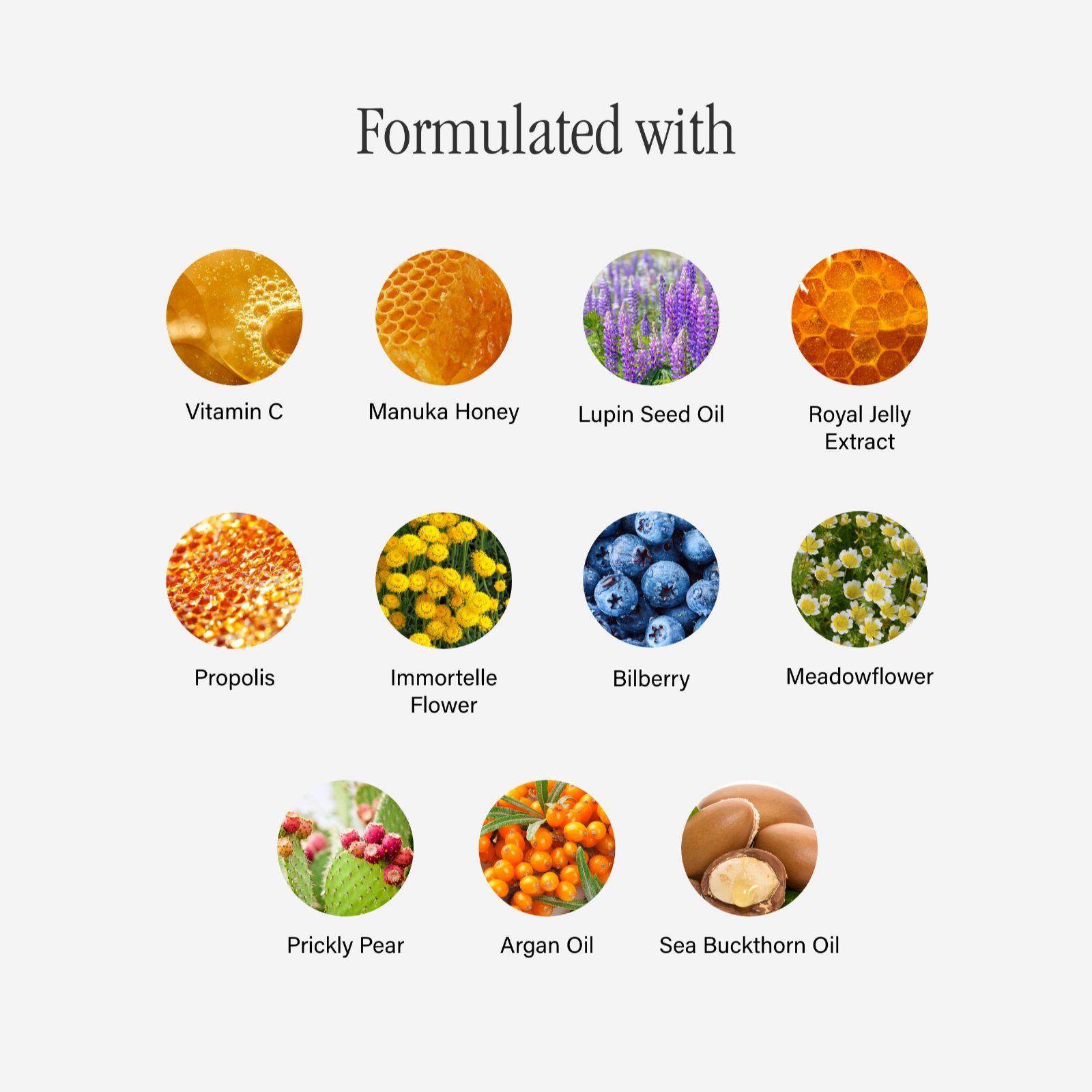 - 1 x Divine Elixir Luminous Facial Oil (30ml) - fortified with manuka honey, propolis, royal jelly, pollen extract, vitamin C, prickly pear seed oil, meadowfoam seed, bilberry seed and sea buckthorn oils, plus kendi, lupine and immortelle oils