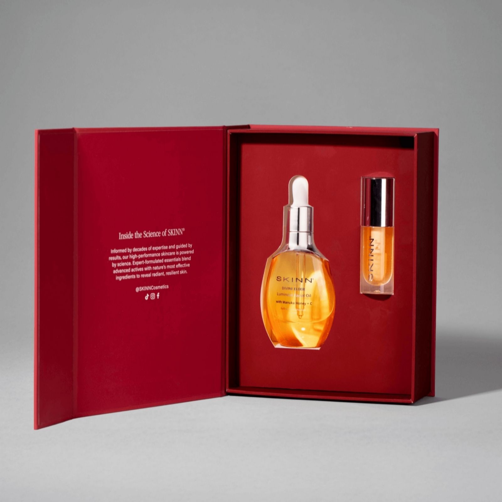 Indulge in a touch of luxury with the SKINN Divine Elixir Gift Collection, featuring a luminous facial oil and golden lip oil designed to help leave skin and lips looking radiant and feeling silky. Perfect for morning or evening use, this duo can slot effortlessly into your beauty routine, whether you're prepping your complexion for make-up or adding a glossy finishing touch to your look.