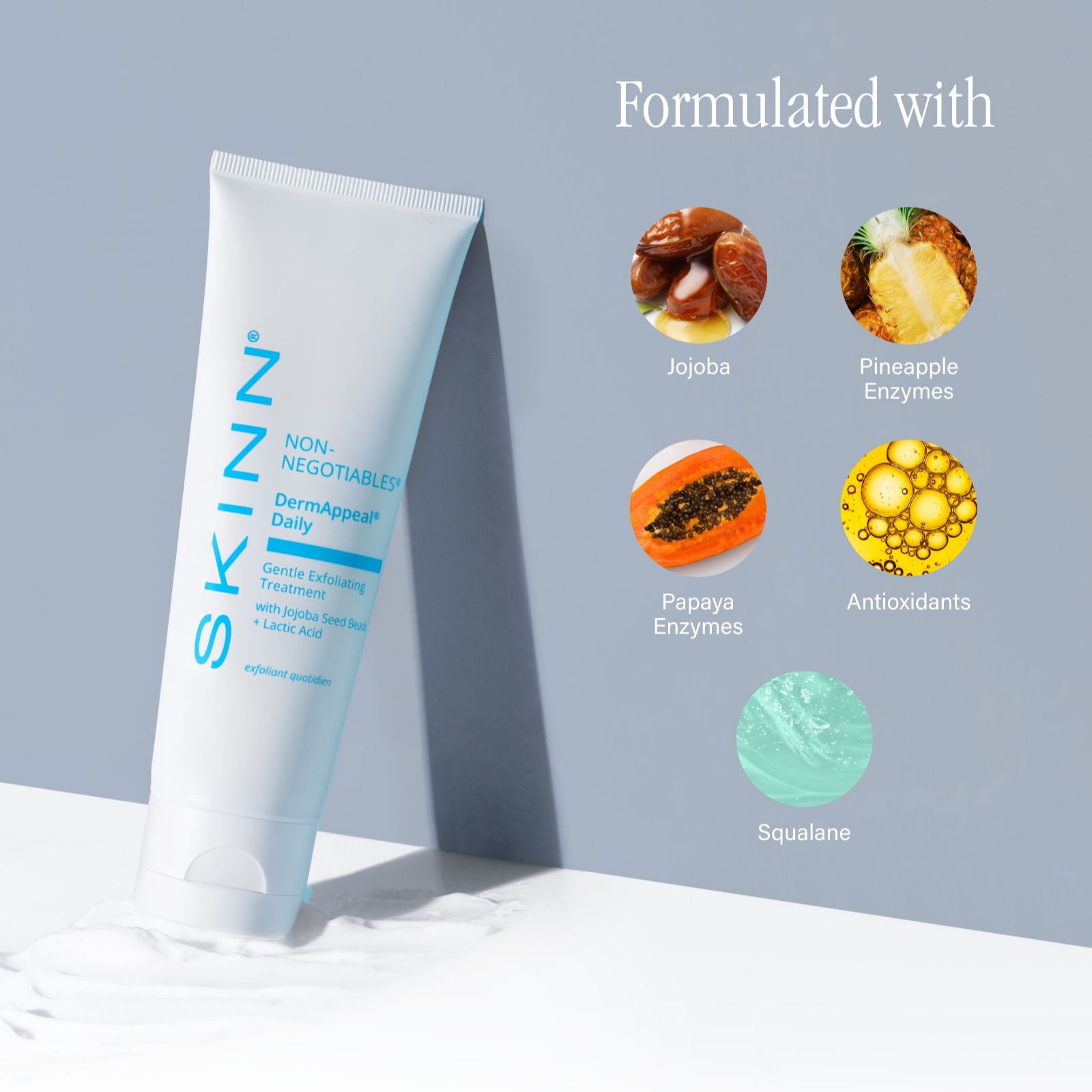 - 1 x SKINN Non-Negotiables DermAppeal Daily (177ml) – gentle exfoliating treatment with botanically-derived jojoba seed beads, lactic acid, fruit enzymes, squalane, sweet almond oil and olive oil