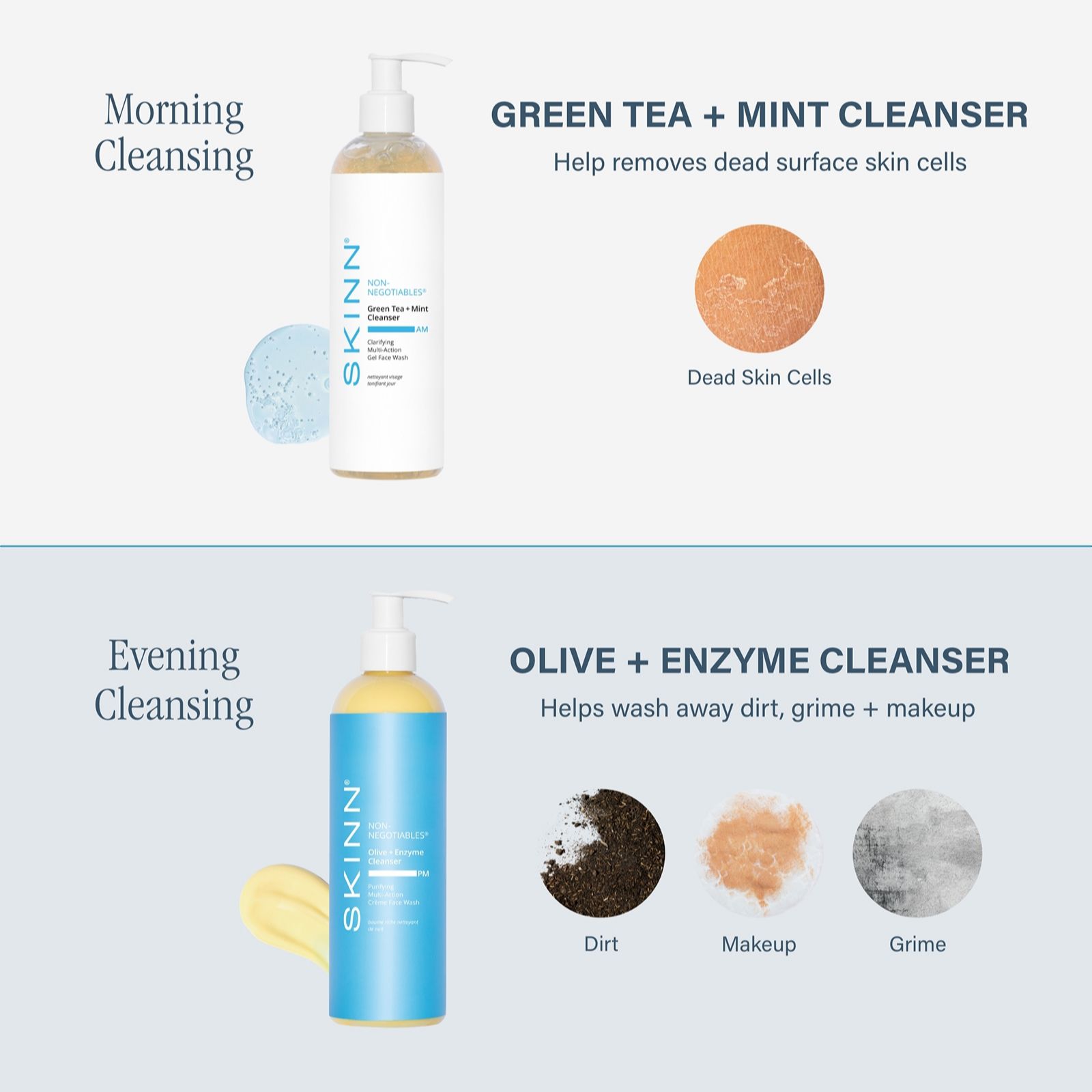 Start your day with a refreshing cleanse using the SKINN Non-Negotiables Green Tea + Mint Cleanser, and unwind in the evening with the SKINN Non-Negotiables Olive + Enzyme Cleanser. This supersize duo is designed to cater to your skin's unique needs at different times of the day; the AM cleanser works to gently exfoliate and polish, helping to wash away impurities and dead skin cells, while the PM cleanser helps to melt away make-up, pollution and impurities without stripping your skin, working to leaving it feeling smooth and refreshed.