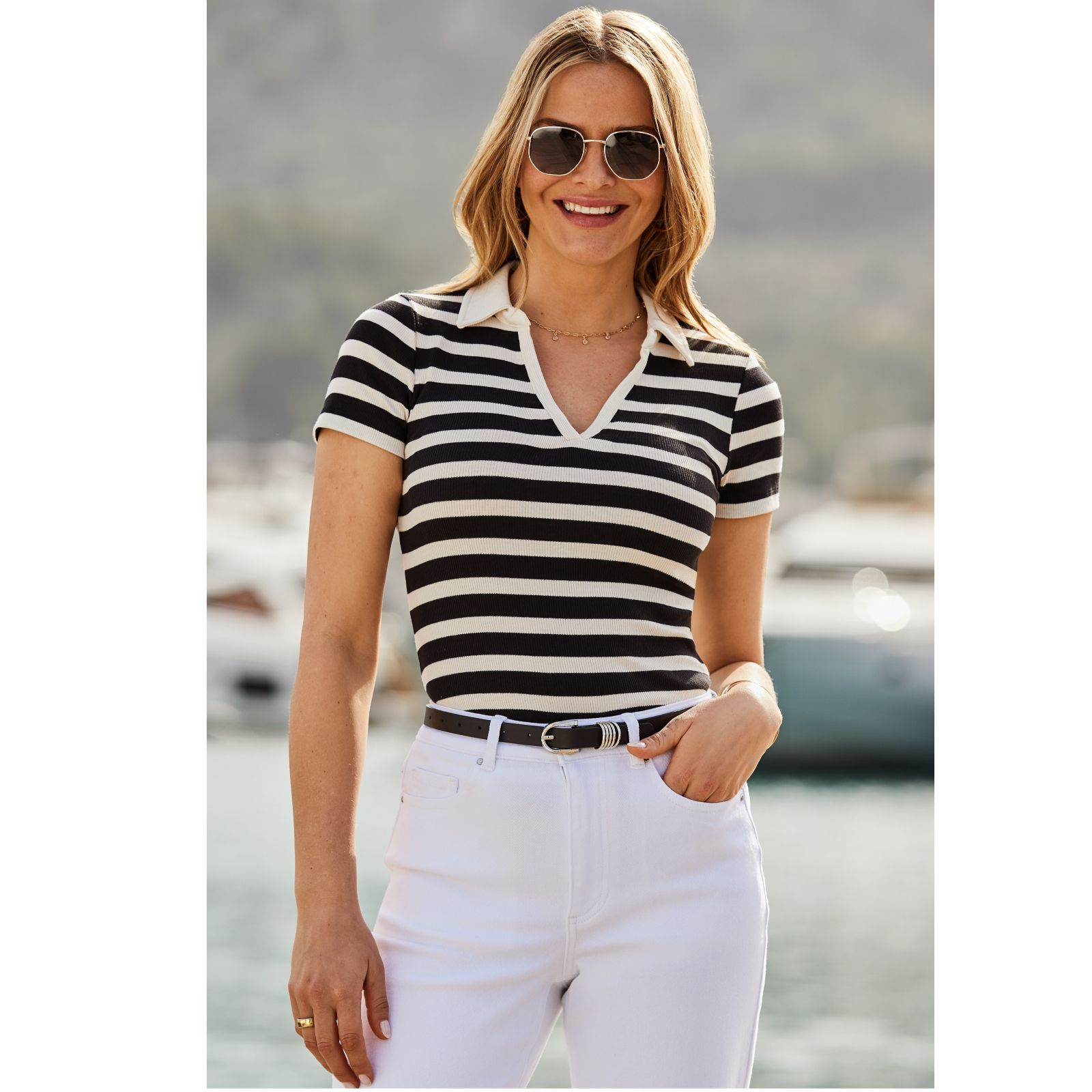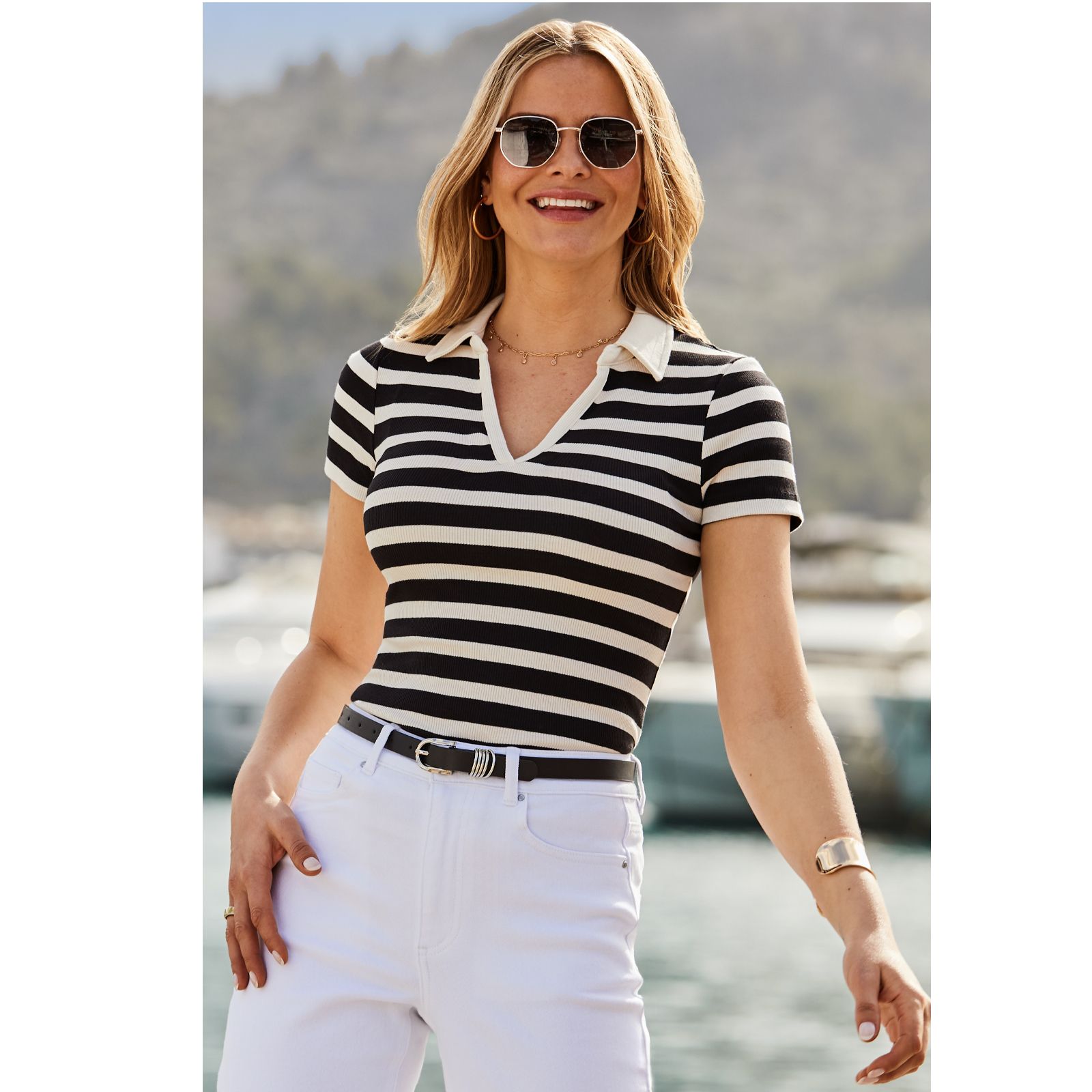 Embrace timeless style with the Sosandar Black & White Stripe Collared Rib Top. This chic top features a flattering collar neckline and a classic stripe pattern that never goes out of fashion. The soft jersey fabric is designed to hug your curves, making it a versatile addition to your wardrobe. Perfect for casual outings or dressed-up events, pair it with white jeans for a fresh summer look or style it with a midi skirt and wedges for a more polished ensemble.