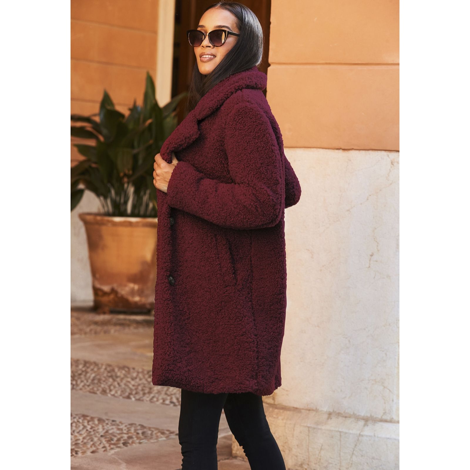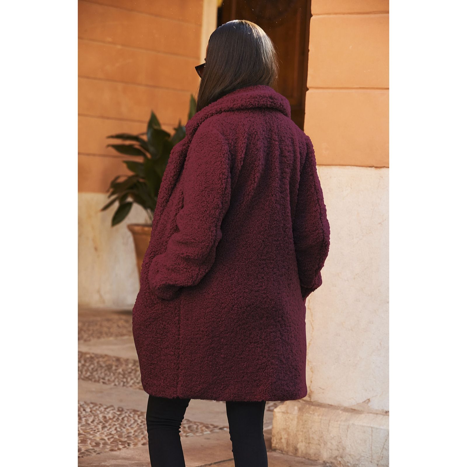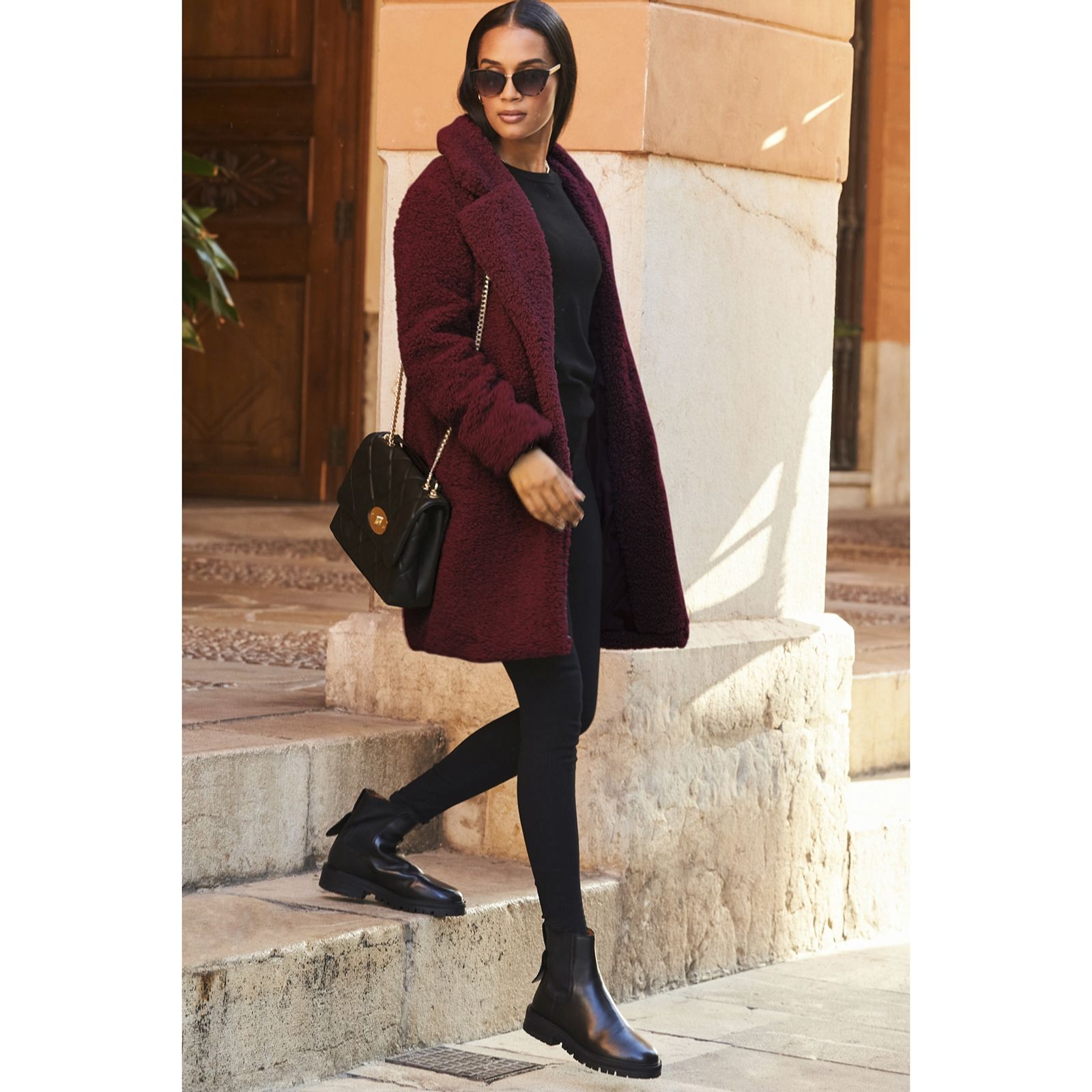 Step out like you're in the streets of Paris with Sosandar's Borg coat in a rich burgundy hue, bringing effortless elegance to chilly days. Crafted in the cosiest Borg fabric with a classic single-breasted design and thigh-length hem, it's perfect for everything from weekend brunches to evening strolls. Layer it over tailored trousers and ankle boots for a chic, city-ready look that works from day to night.