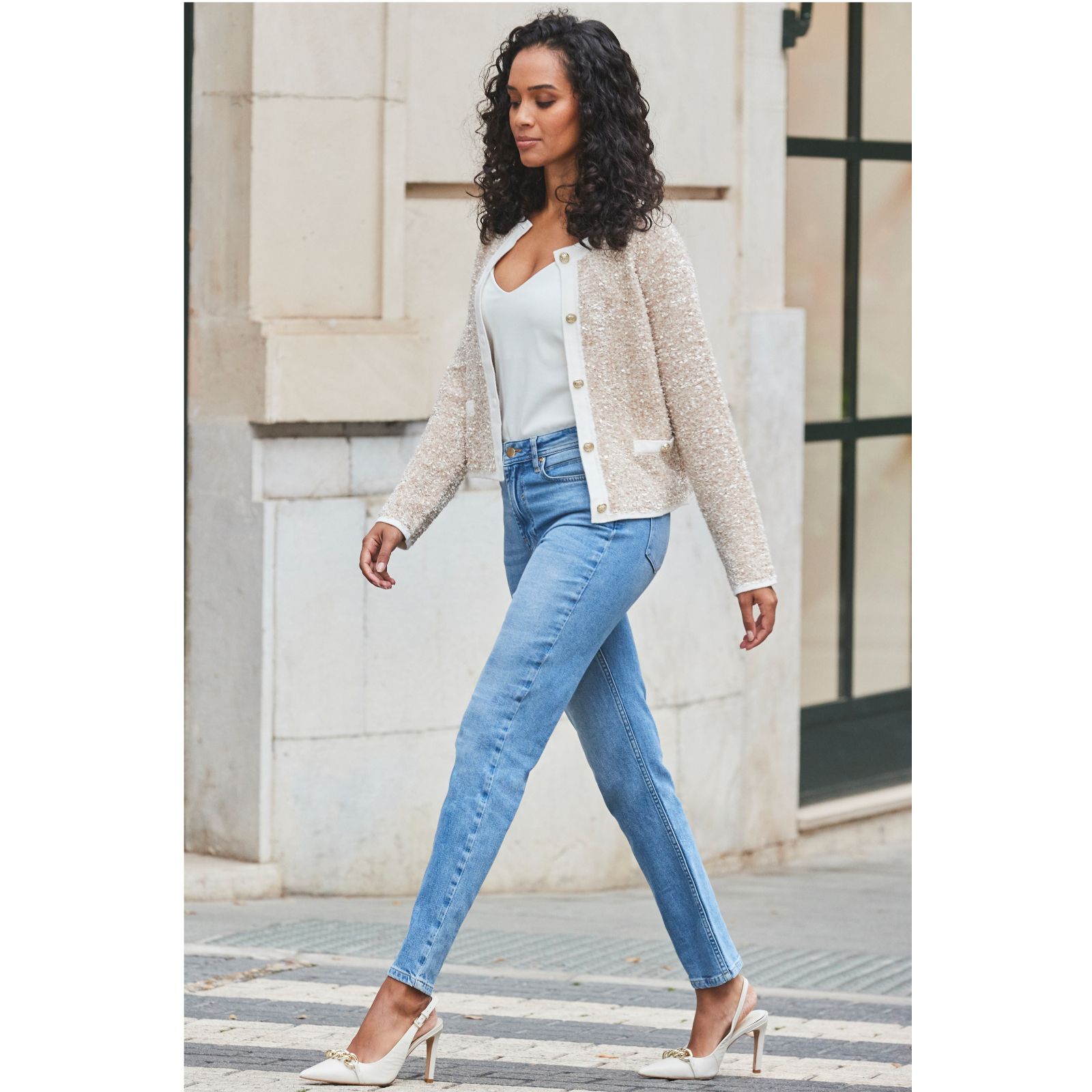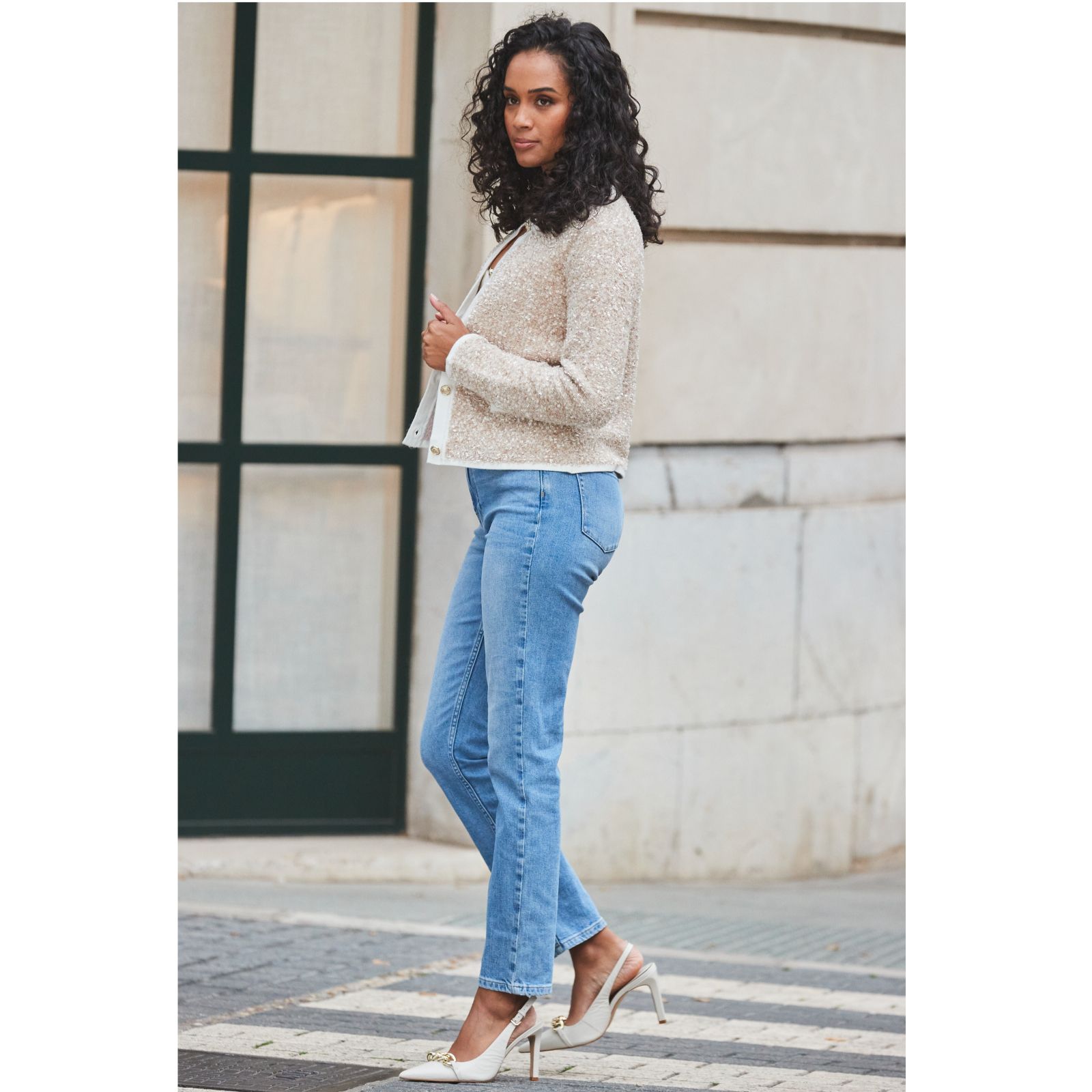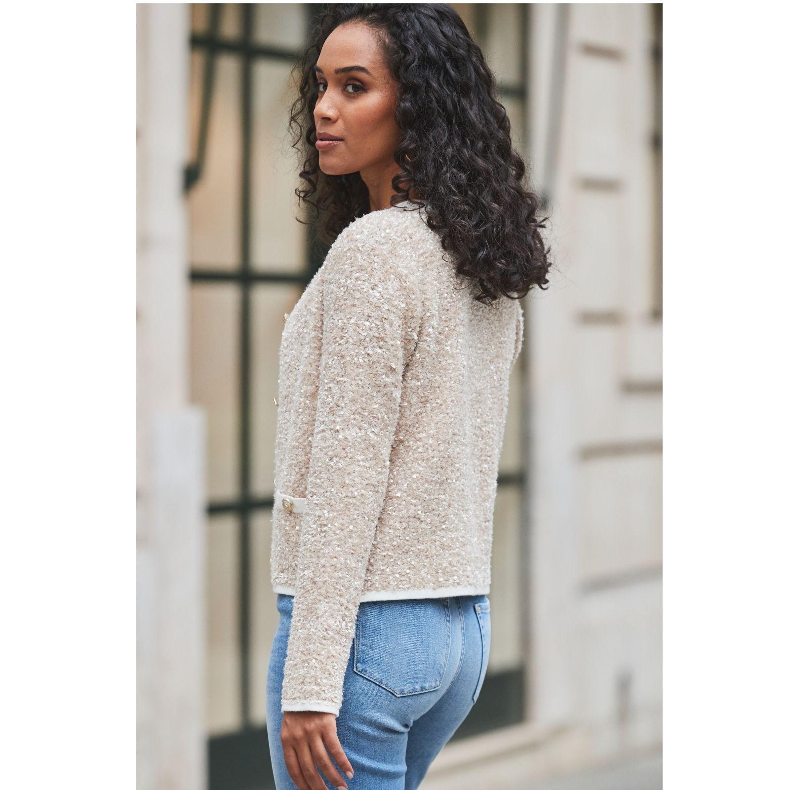 Add a touch of sophistication to your wardrobe with the Sosandar Boucle Gold Button Trophy Cardigan. Crafted from luxurious boucle fabric, this chic cardigan is adorned with elegant gold buttons that elevate its style. Its versatile design makes it perfect for layering over jeans or leather trousers, whether you're heading to a casual brunch or a stylish evening out. Wear it buttoned up for an on-trend look that's effortlessly fashionable.