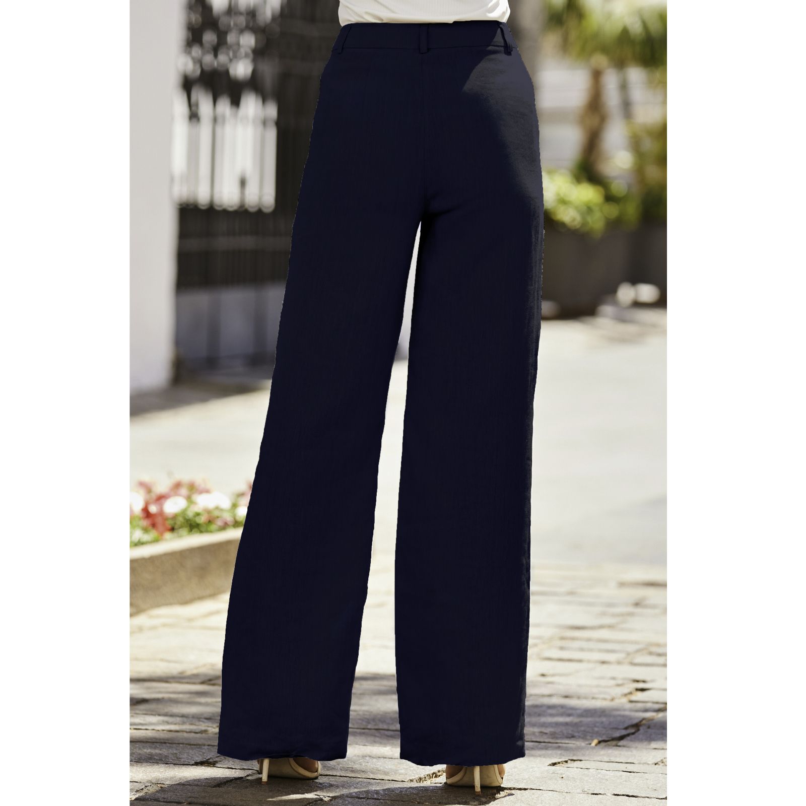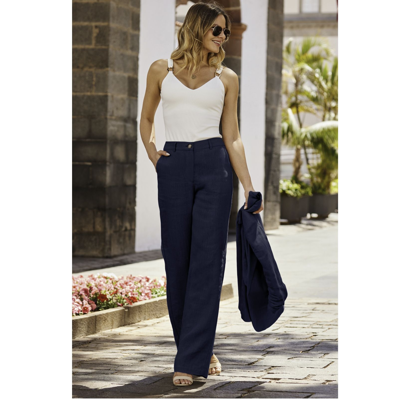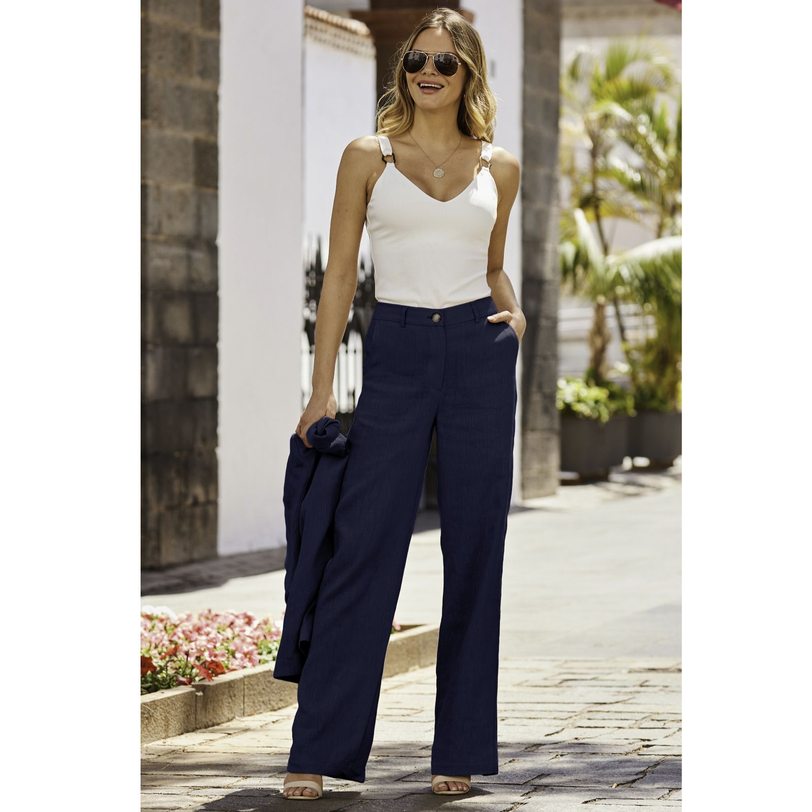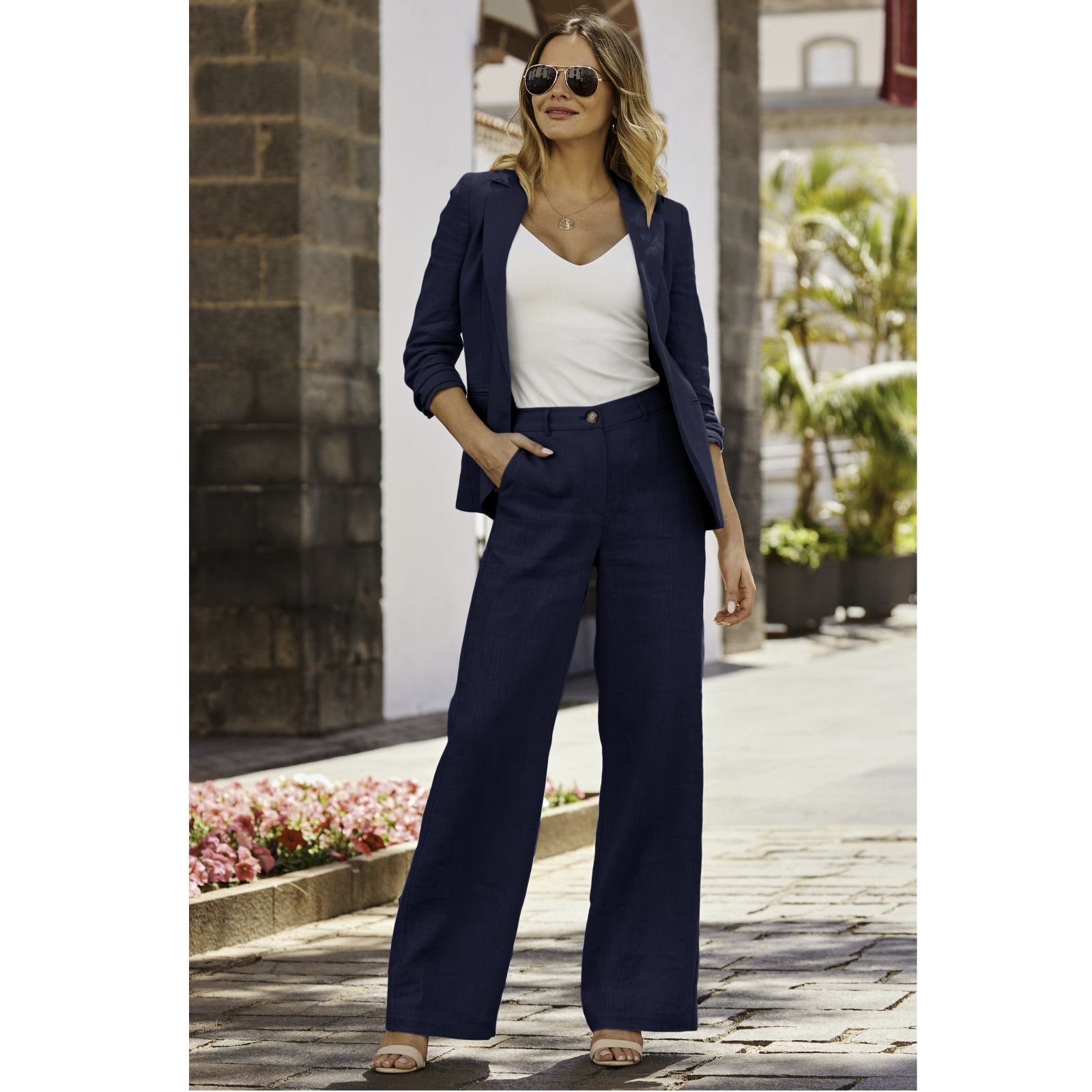 Step into effortless style with the linen-blend wide-leg trousers from Sosandar. Designed in a semi-relaxed fit with a chic wide-leg cut, they're finished with an elegant mock-horn button for a polished touch. Perfect for everything from weekend brunches to warm-weather evenings, these trousers pair beautifully with a navy blazer for a co-ordinated look or simply team with a vest and flat sandals for laid-back charm.