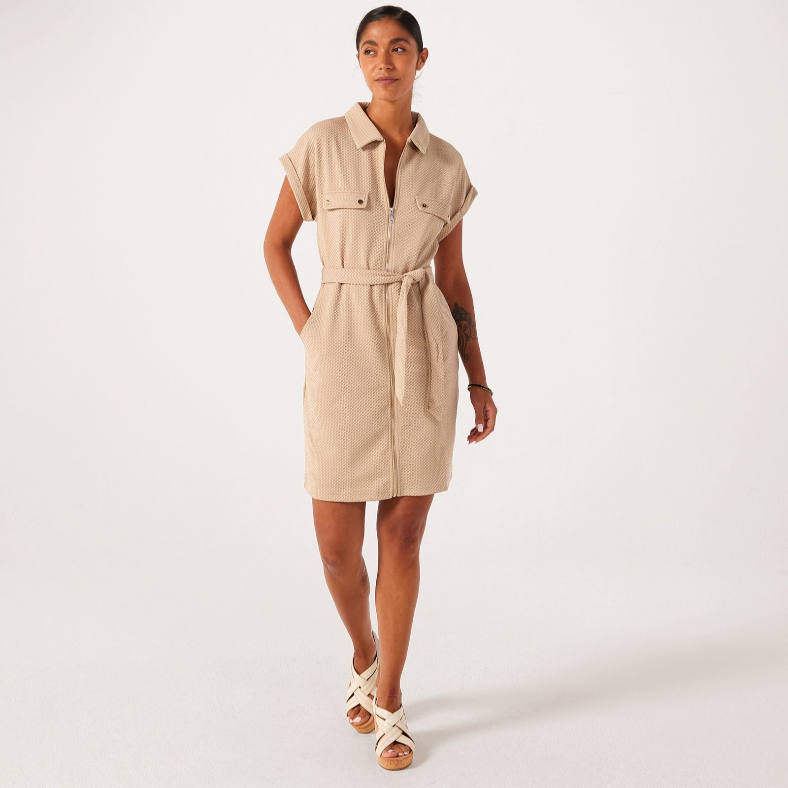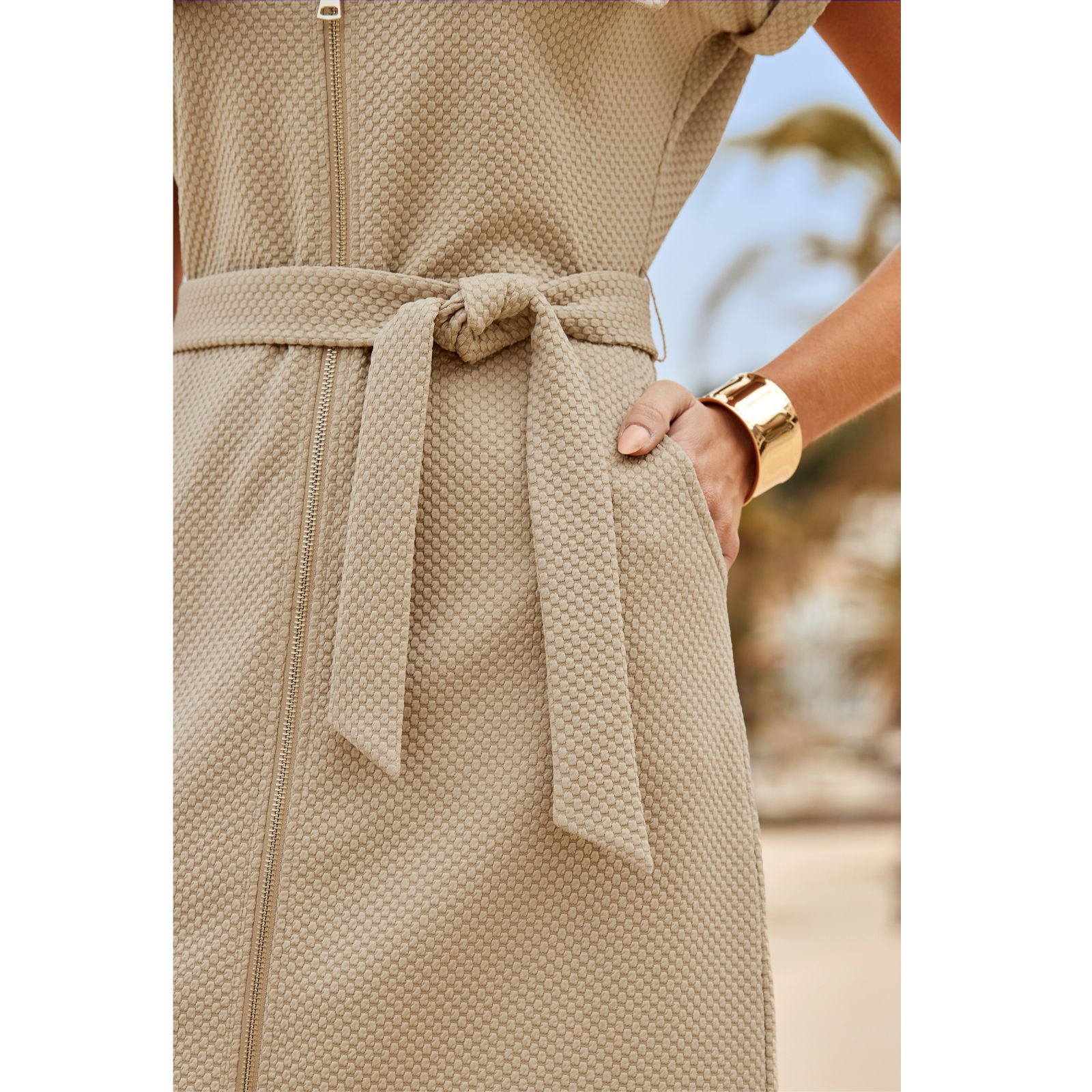 Find yourself ready for anything with this textured zip front belted dress from Sosandar, blending timeless shirt dress style with a touch of luxury thanks to its soft fabric, gold hardware and utility-inspired details. Effortlessly chic yet comfortable, its relaxed fit and waist-cinching tie belt make it a versatile choice for both busy weekdays and weekend plans. Pair with wedges, courts or trainers for instant polish.