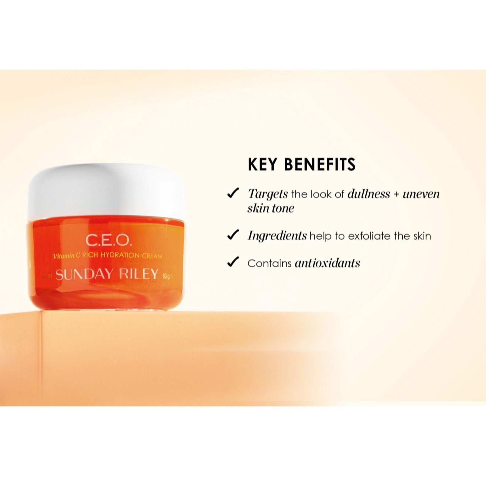 - 1 x C.E.O. Vitamin C Rich Hydration Cream (50g; full size) - an intensively hydrating cream that targets the look of dullness and uneven skin tone, for a brighter appearance. Formulated with a form of vitamin C called THD ascorbate