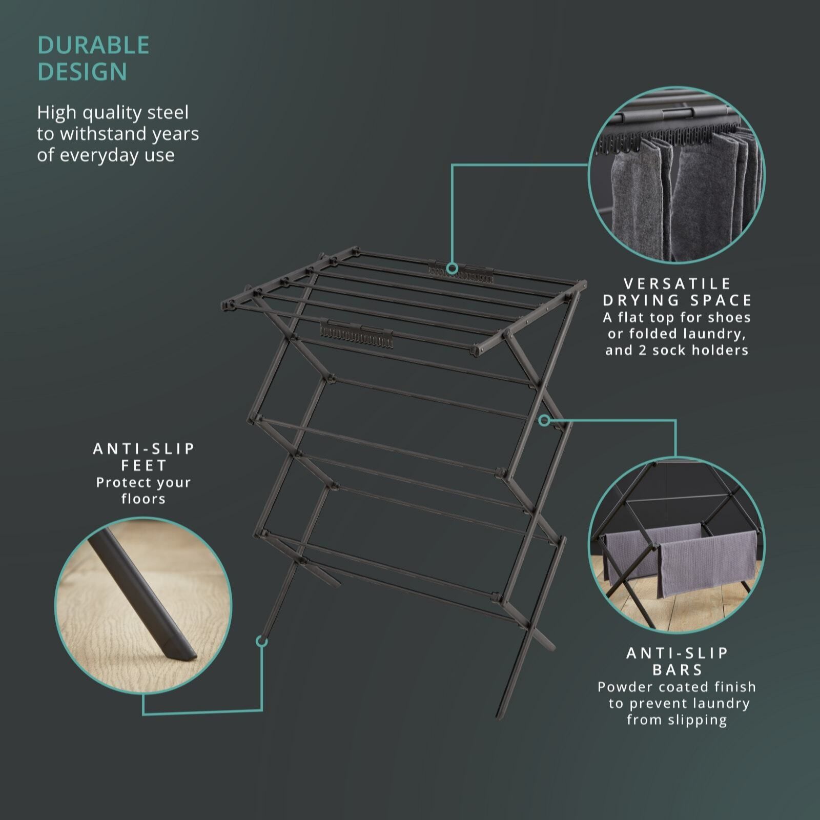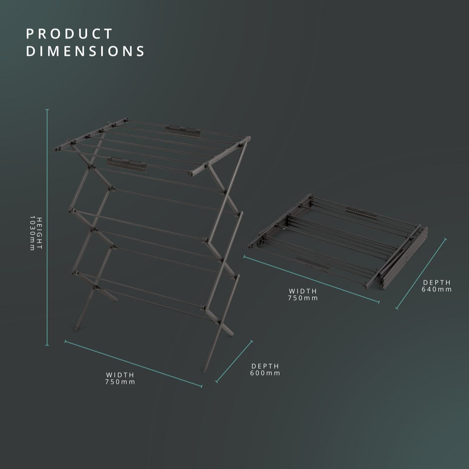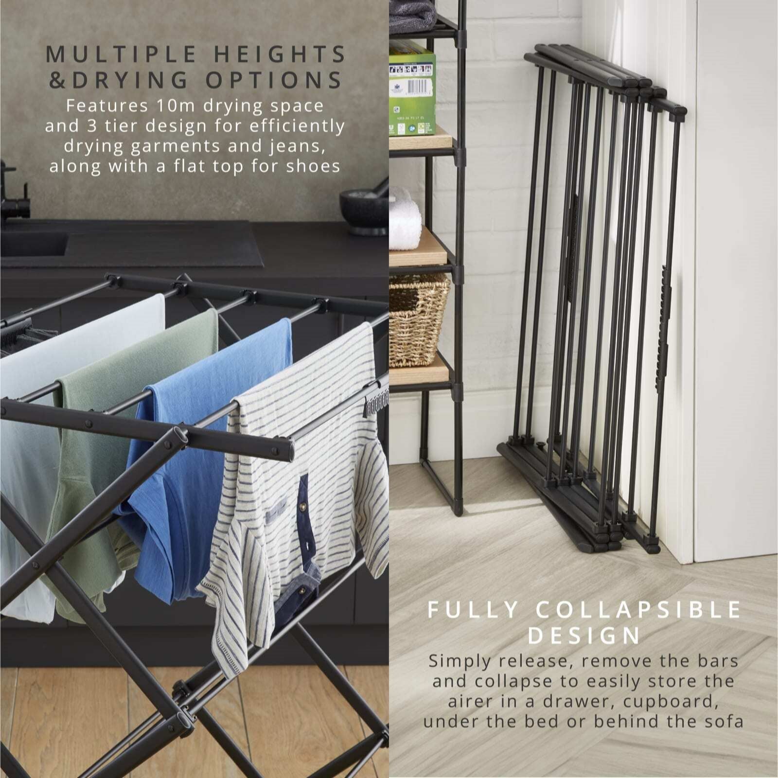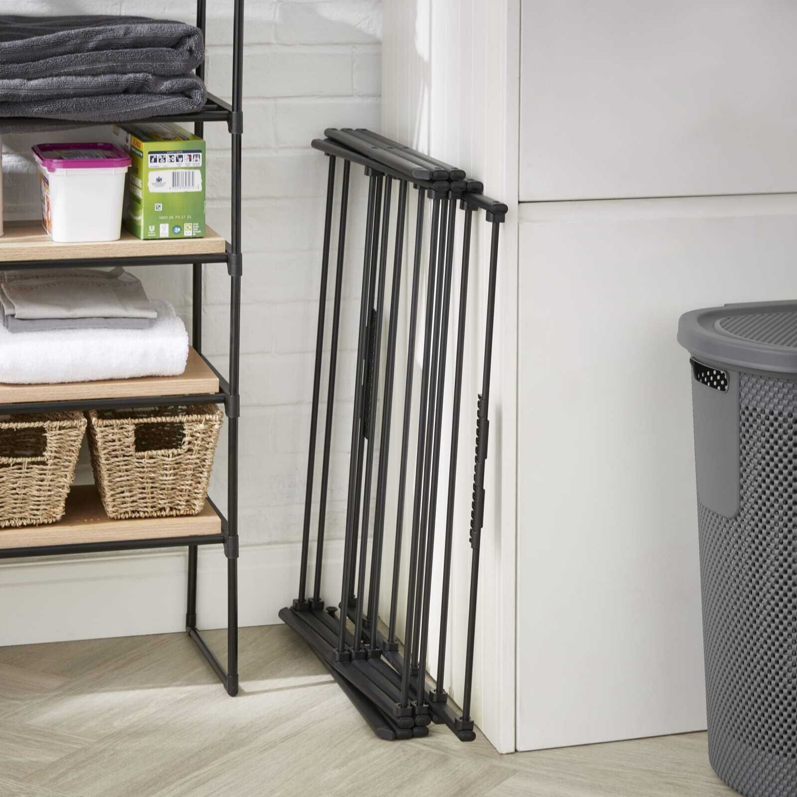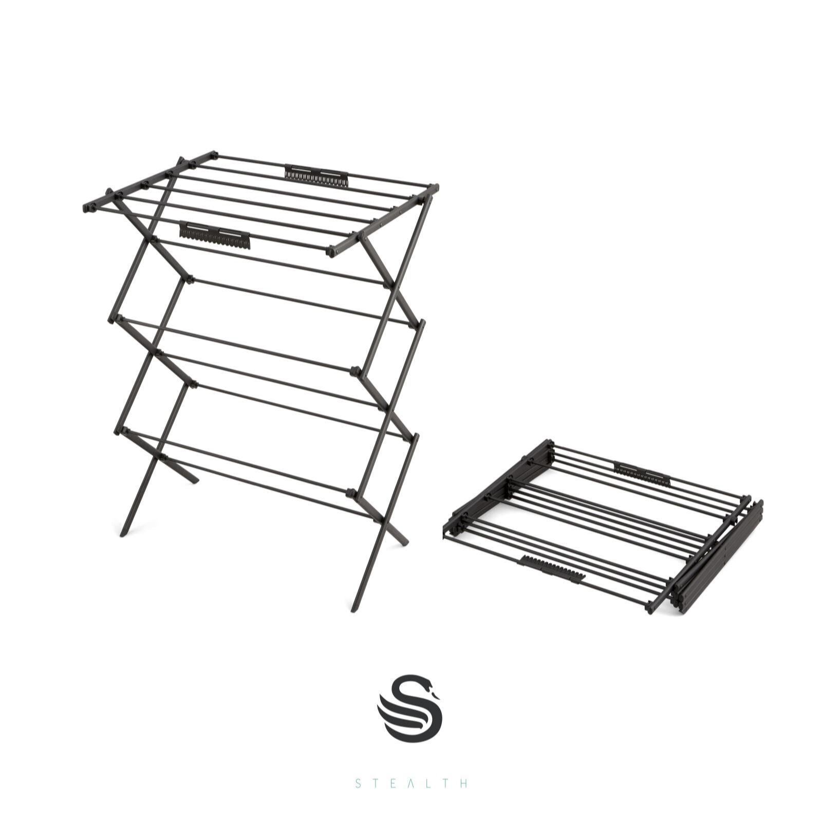 Make laundry days easier with Swans Stealth Ultra-Compact Airer, designed with a sturdy concertina frame and a sleek matt black anti-slip finish to help maximise your drying space without sacrificing style. The three-tier design offers multiple heights, a flat top for folded clothes or shoes, and two handy sock holders, making it a practical and space-saving alternative to a tumble dryer.