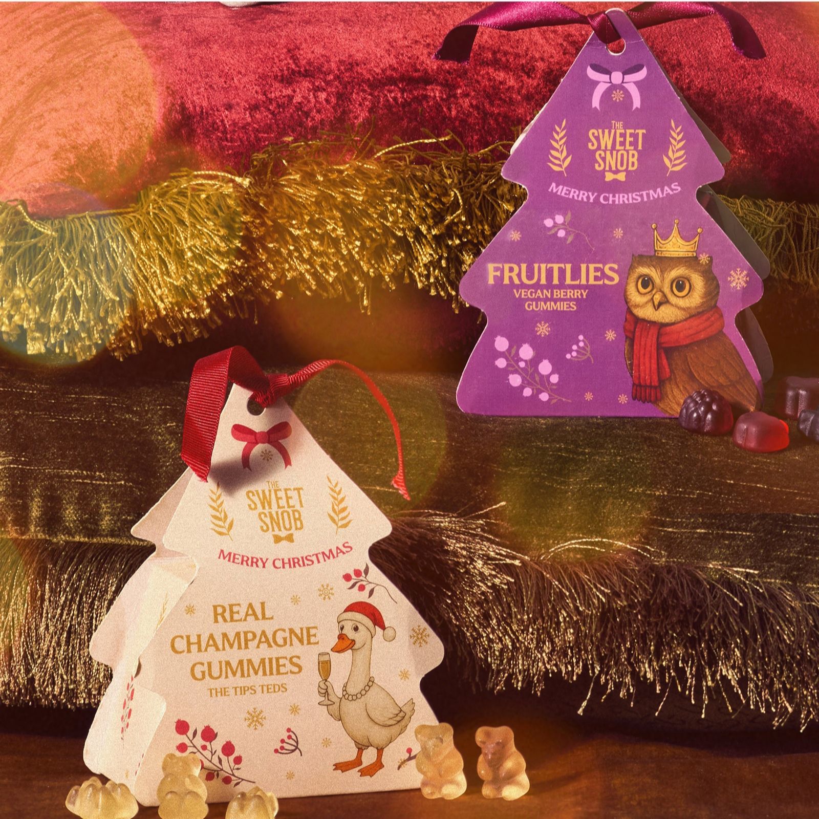 Add a festive sparkle to your celebrations with The Sweet Snob's set of six Christmas Tree Ornaments, each charmingly illustrated and filled with luxury gummies. Enjoy three Real Champagne Gummies, crafted with genuine French champagne for a bold, bubbly treat, plus three Fruitlies Vegan Berry Gummies, bursting with 20% real fruit juice and naturally vibrant colours. Perfect for gifting, hanging or indulging, these whimsical tree boxes elevate any holiday moment.
