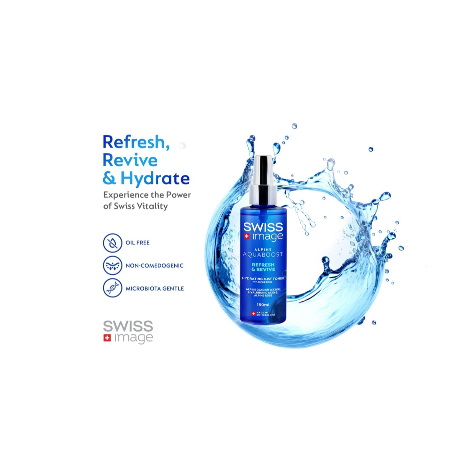 - 1 x Aqua Boost Refresh & Revive Hydrating Mist Toner (150ml) -lightweight, water-based formula with Alpine glacier water, Alpine rose extract and hyaluronic acid