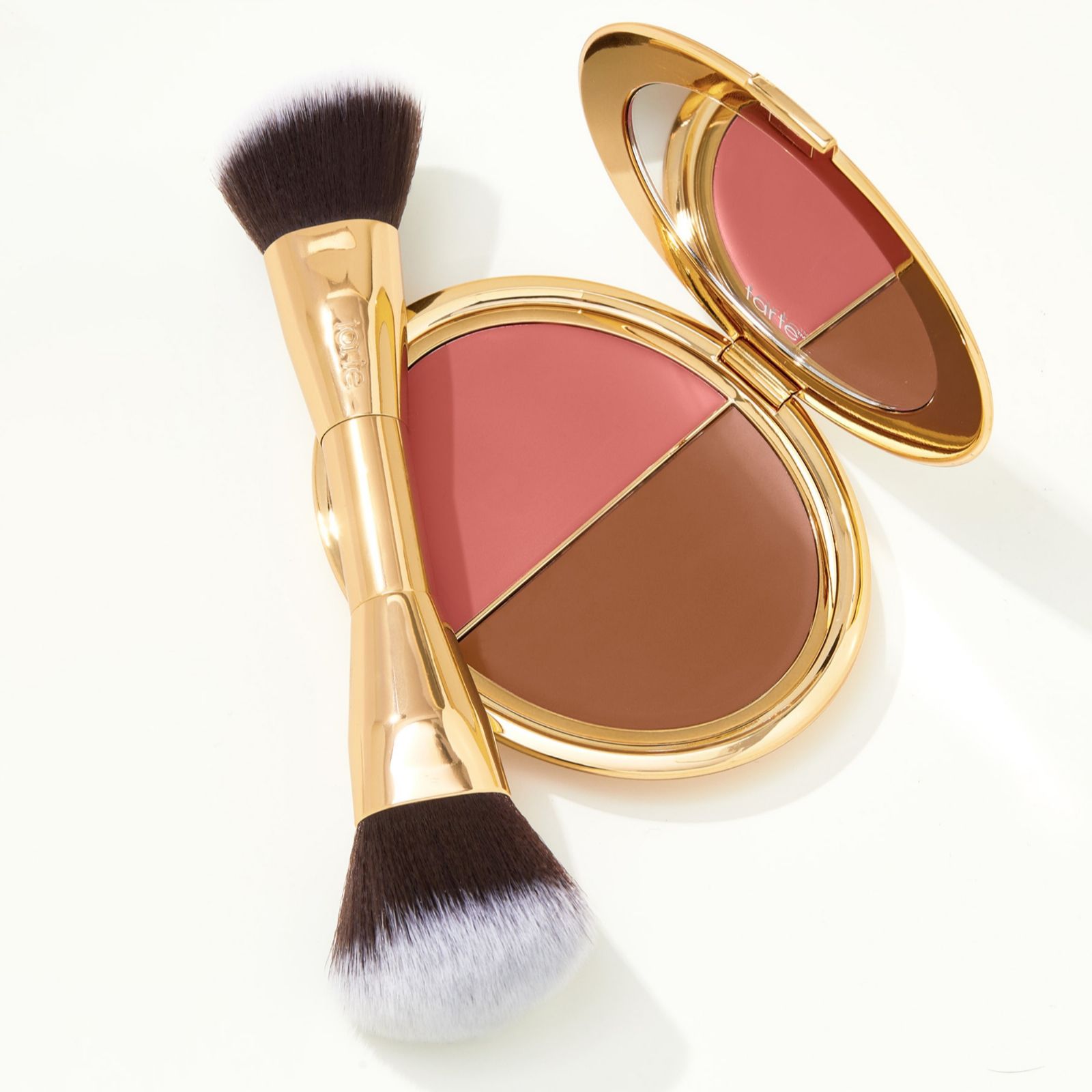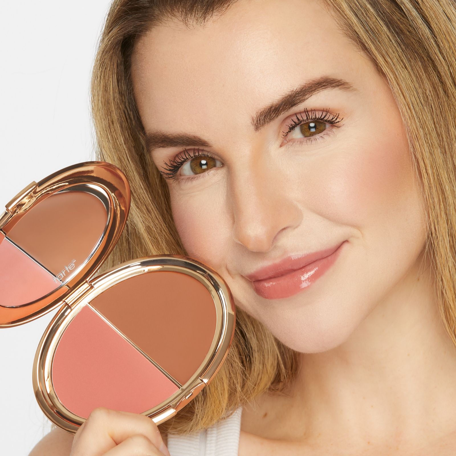 Elevate your cheek game with the tarte Park Ave Princess Cream Blush & Bronzer Cheek Duo, complete with a specially designed brush for flawless application. This versatile duo is perfect for creating a sun-kissed glow or a subtle flush of colour, making it an essential addition to your makeup routine. Whether you're aiming for a natural daytime look or a more defined evening style, this set has you covered for every occasion.