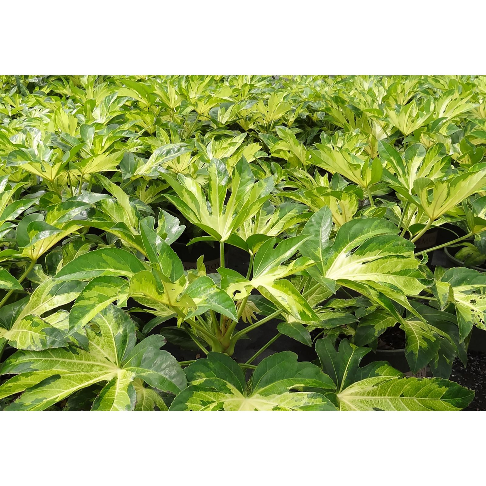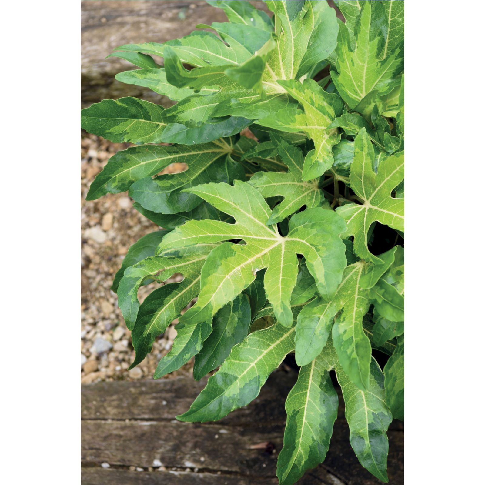 Add a touch of tropical flair to your garden with this Fatsia Camouflage shrub from Thompson & Morgan. Boasting large, deeply dissected leaves splashed with green and gold, this hardy evergreen plant is perfect for brightening up shady corners or making a statement in a container. With clusters of white flowers in autumn followed by black berries, this versatile shrub offers year-round interest in various garden settings.