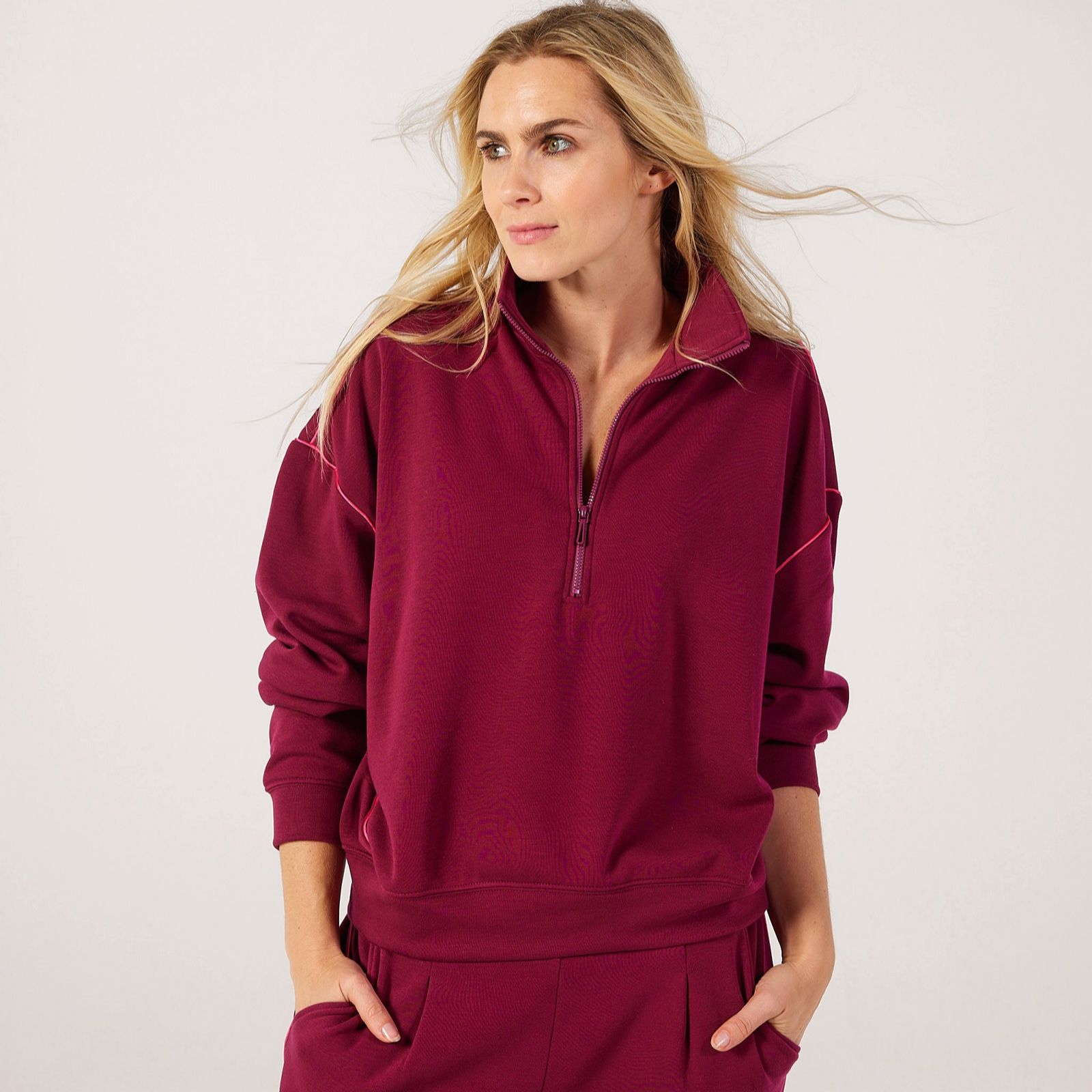 - Stand-up collar with a half zip