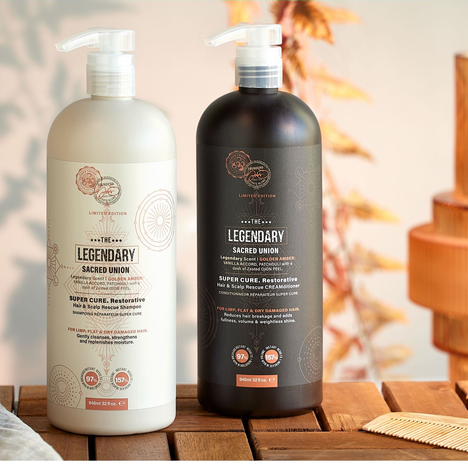 - 1 x NEW Supersize Legendary Sacred Union Founder's Blend Super Cure Hair & Scalp Rescue Shampoo (946ml) - cleanses hair and scalp without weighing hair down, helping to lock in moisture without making your scalp greasy. Suitable for all hair types, especially dry, damaged, brittle or coloured hair. Enhanced with the Founder’s Blend of rare, wild-crafted actives