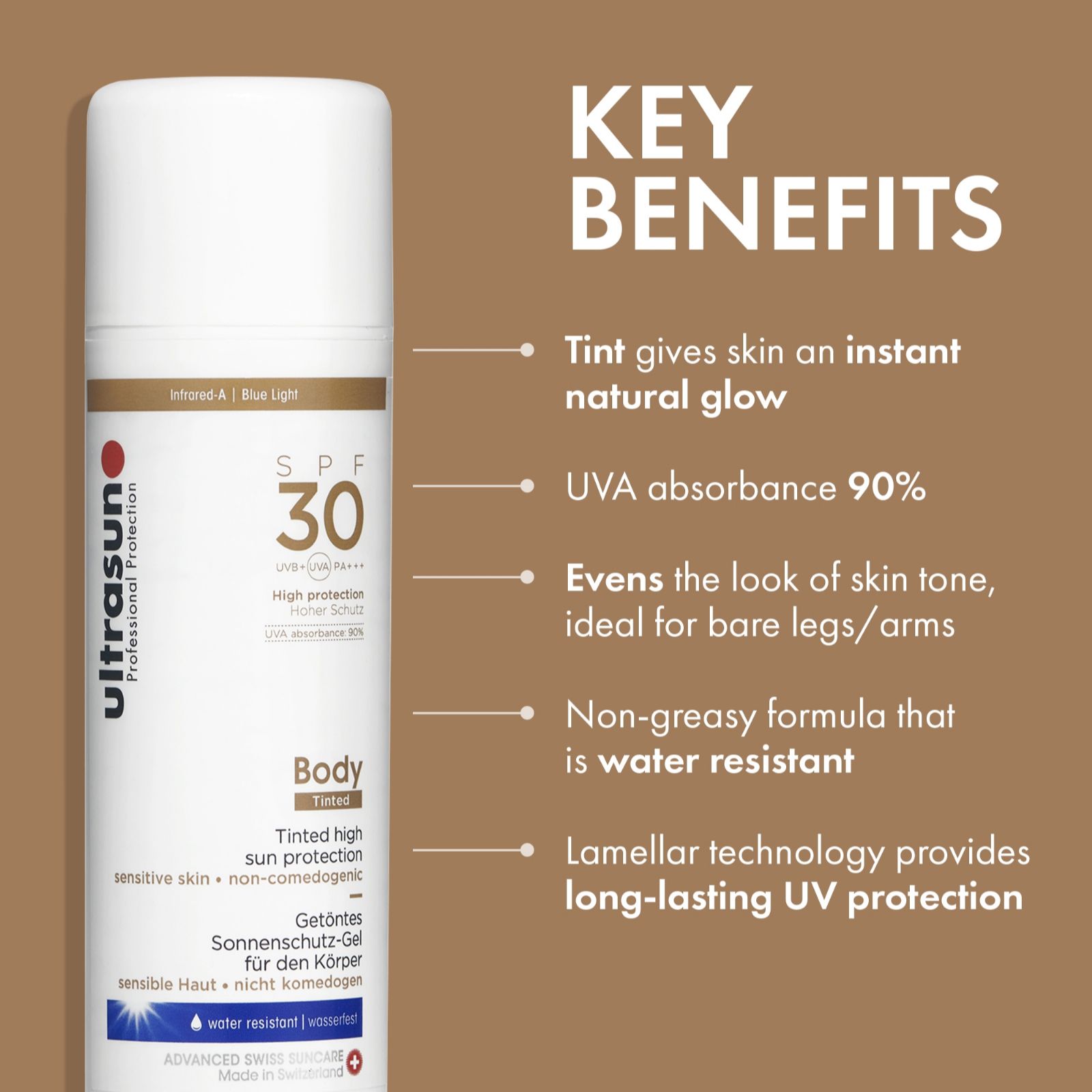 - 1 x Ultrasun Tinted Body SPF30 (250ml; supersize) - a fast-absorbing, non-greasy, non-sticky UVA and UVB (SPF30) sun protection gel, formulated with lamellar technology to help protect your skin from infrared radiation and blue light. Works to give your skin an even, bronzed radiance while helping to cover imperfections