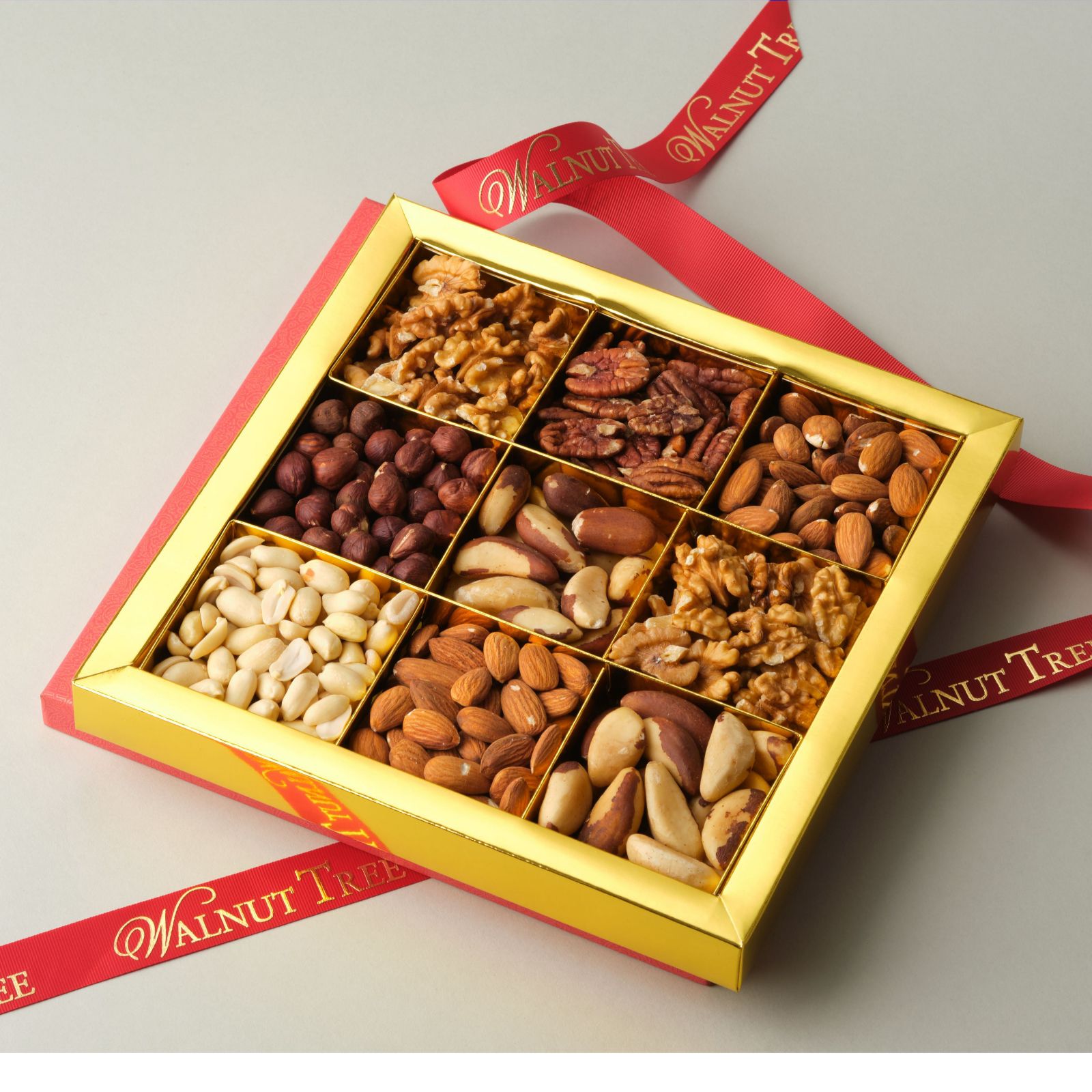 - Elegant red-and-gold gift box tied with Walnut Tree's signature ribbon