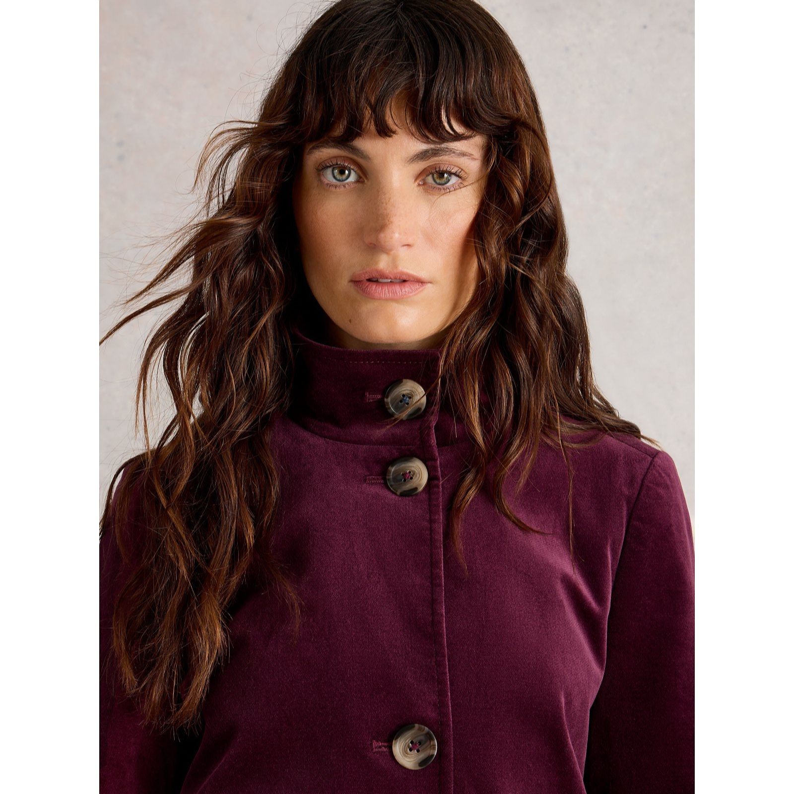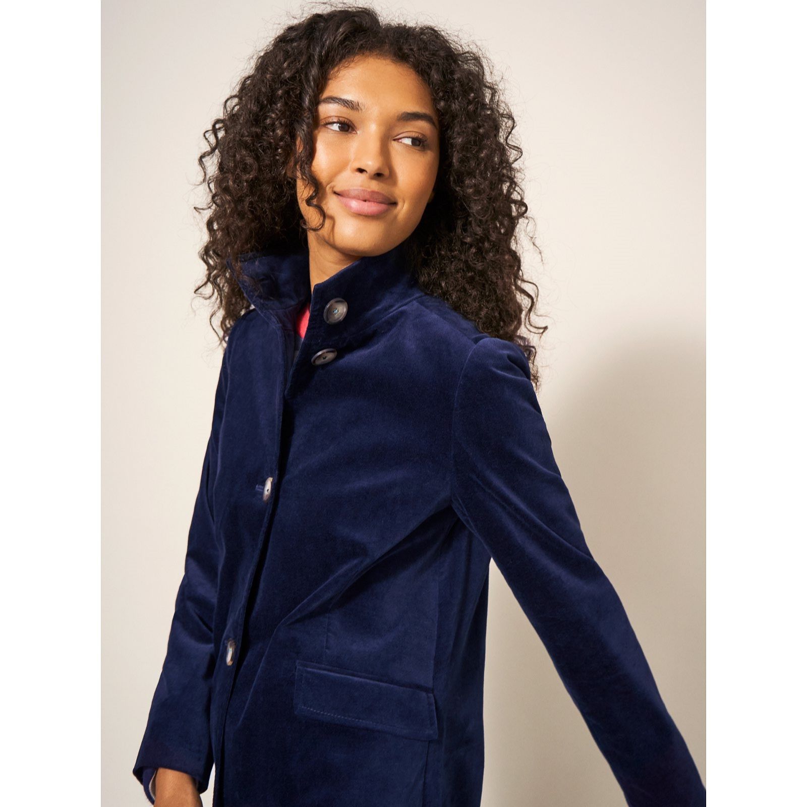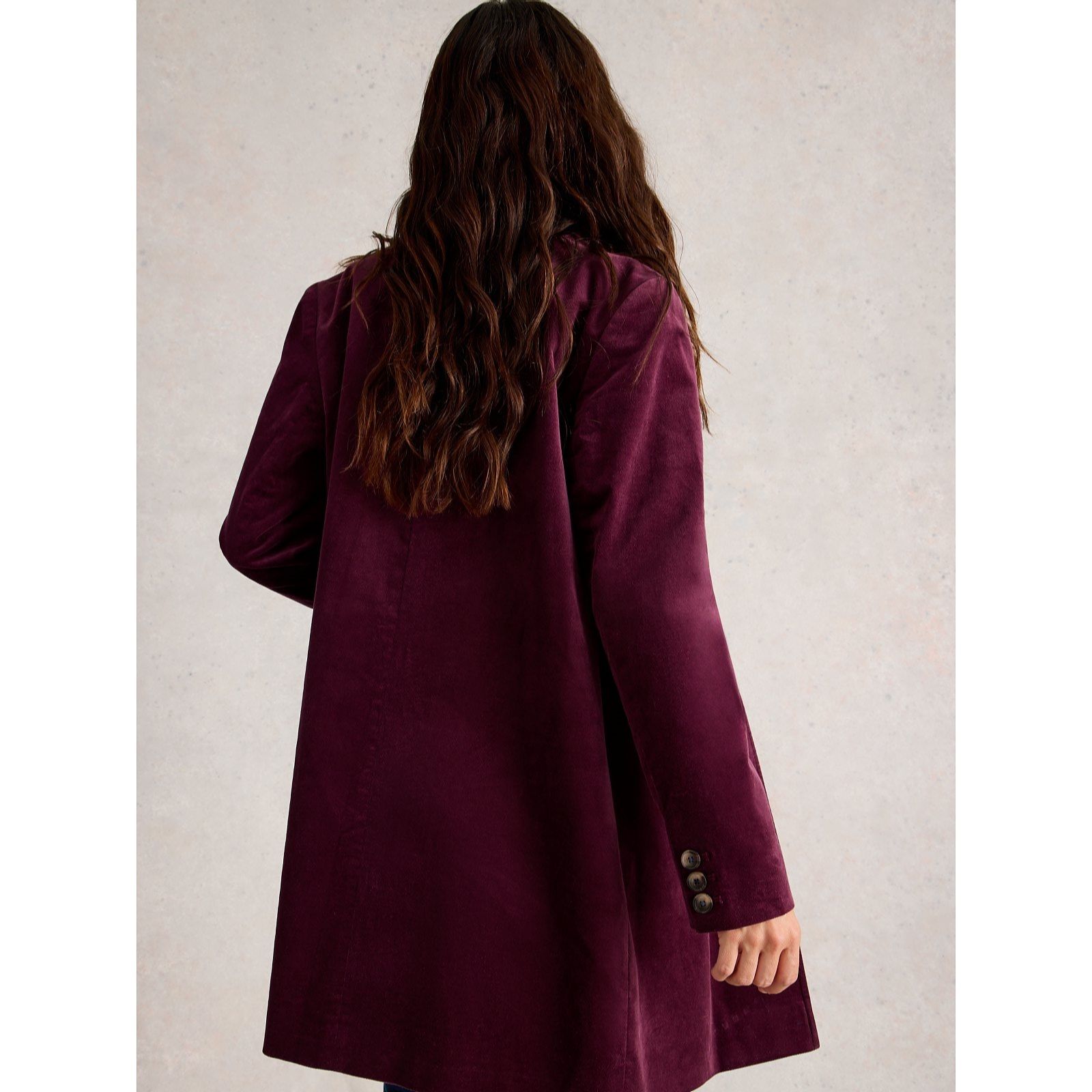 Exude chicness with the Karla velvet coat from White Stuff, a sumptuous design that blends timeless tailoring with a touch of opulence. Featuring a sleek funnel neck, button fastening and practical pockets, its soft velvet finish makes it perfect for elevating your look at everything from weekend outings to evening gatherings. Try layering it over a fine-knit jumper and tapered trousers for an effortlessly polished ensemble.