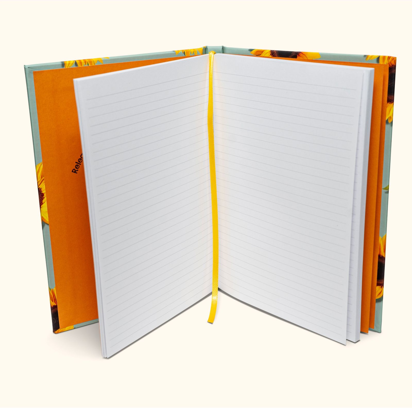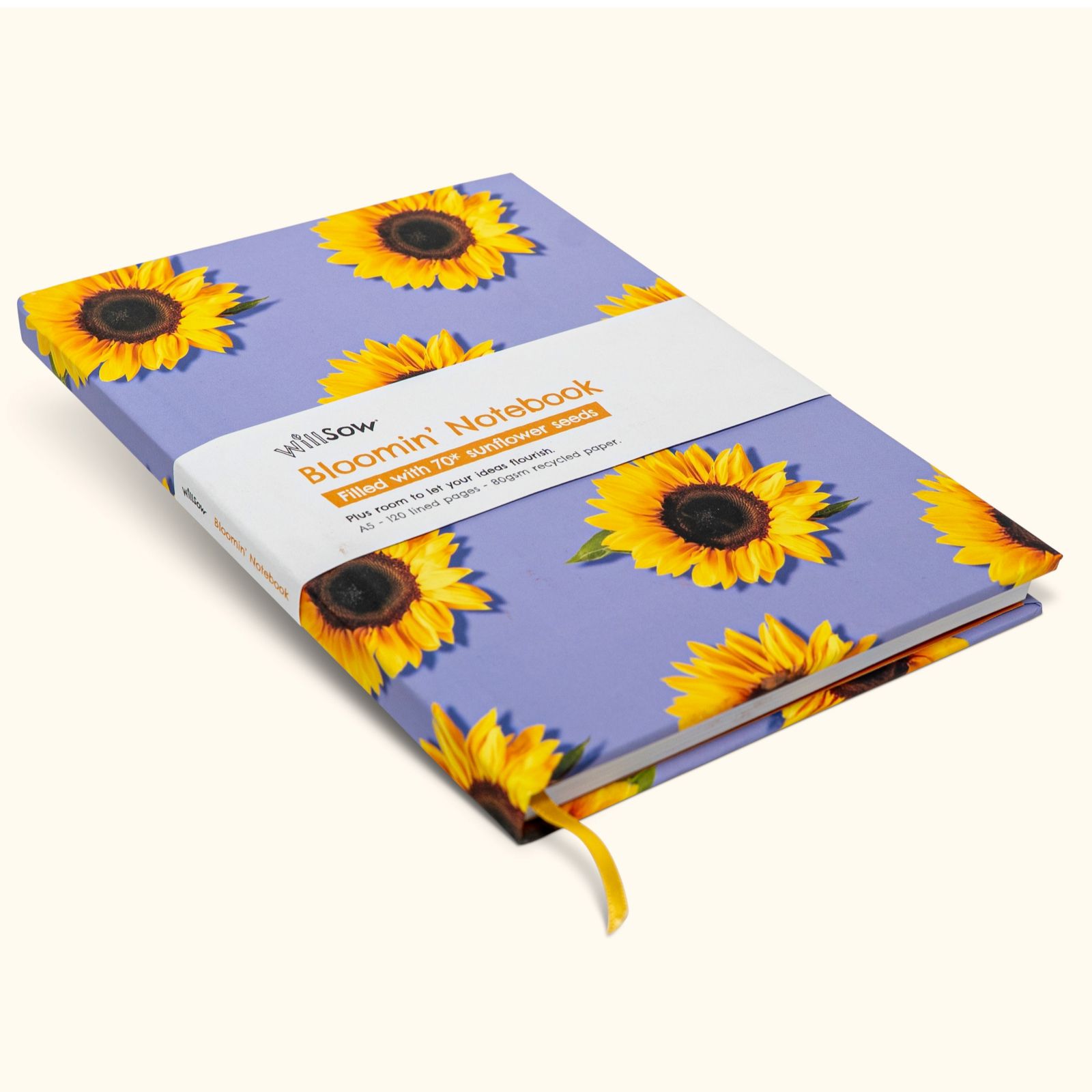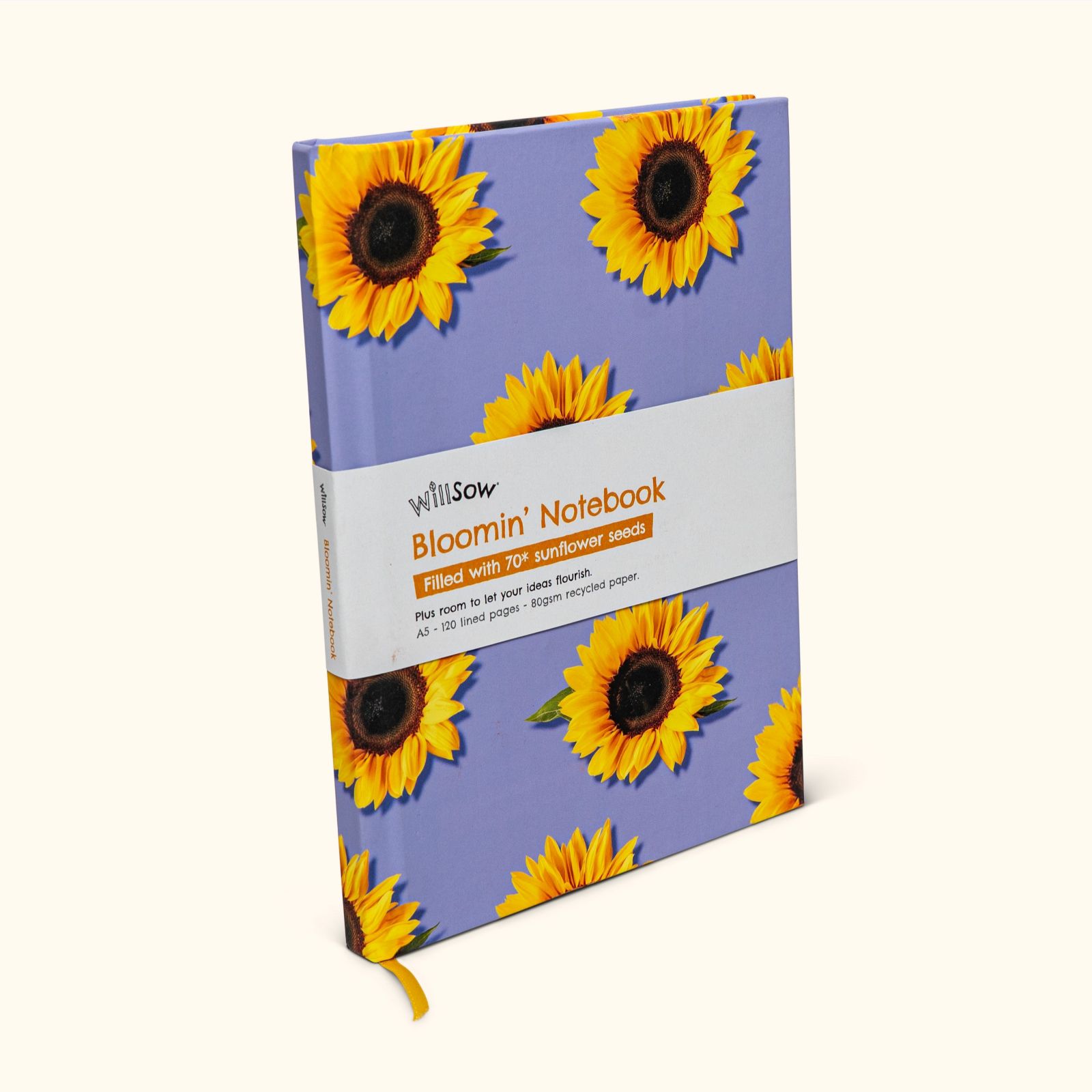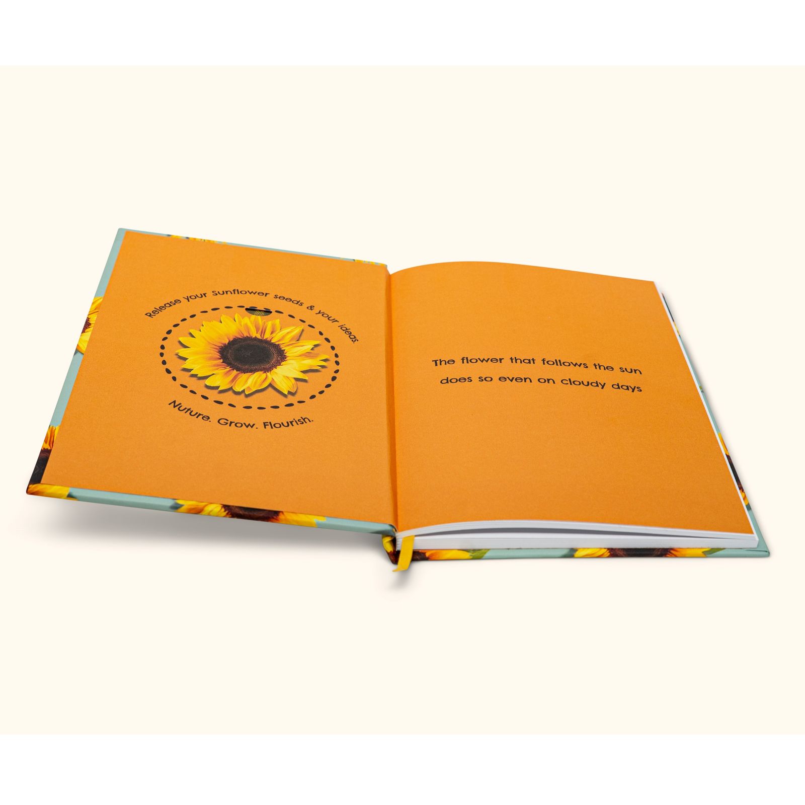 - Lined hardback notebook with sunflower seeds concealed within the front cover