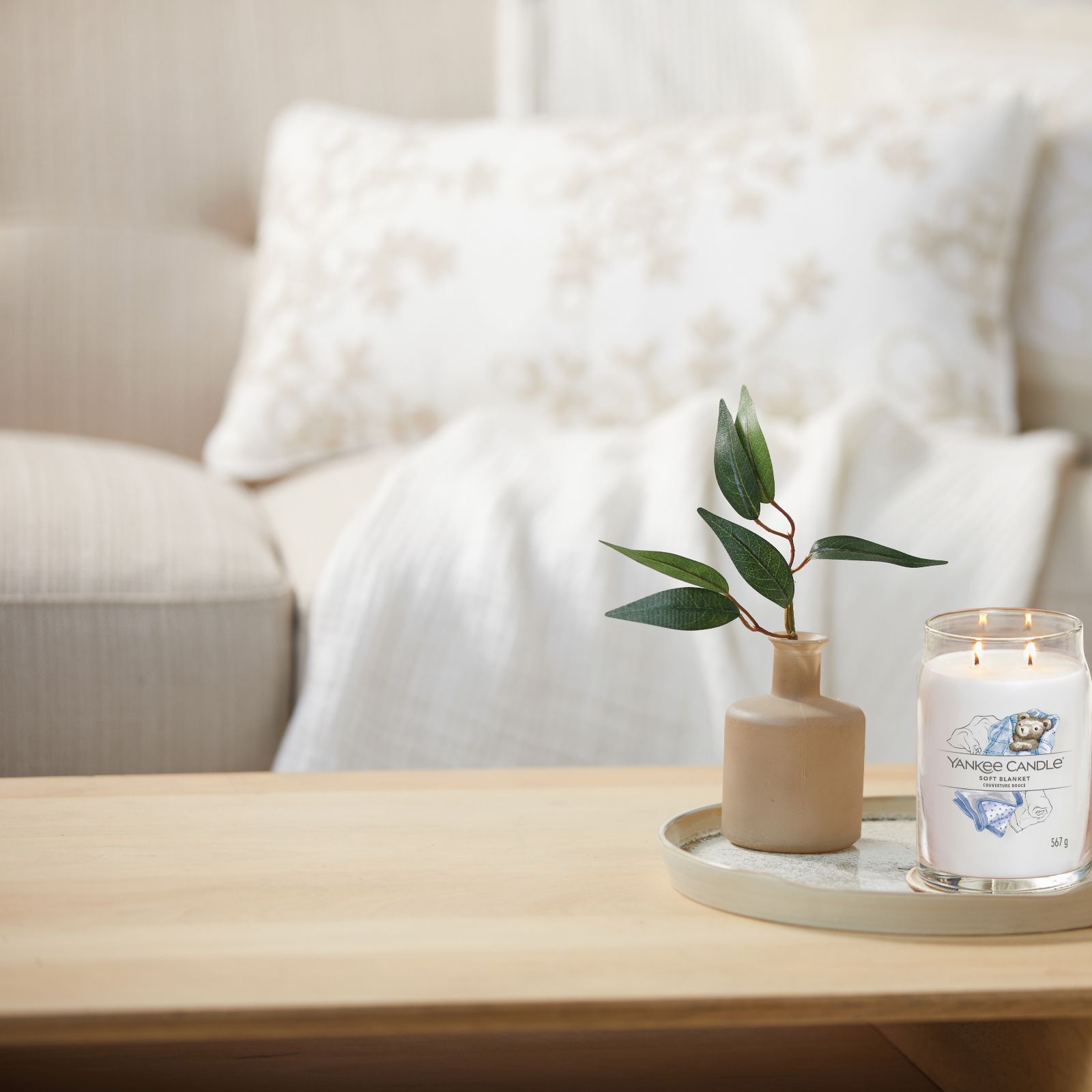 Wrap your senses in comfort with the Yankee Candle Soft Blanket Signature Large Jar, blending a modern take on their iconic jar with a soothing fragrance of clean citrus, luxurious vanilla, and warm amber. Perfect for relaxing evenings or creating a tranquil atmosphere, this premium soy wax candle with two wicks delivers a beautiful, long-lasting glow.