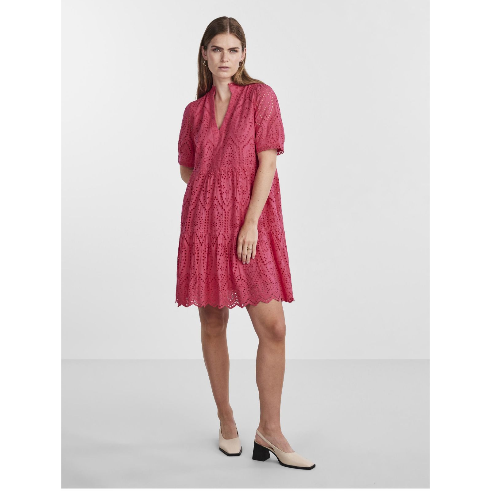 Dive into the summer season with the Yas Broiderie Dress, a testament to timeless elegance and comfort. Crafted from 100% cotton, this dress promises breathability and ease, making it perfect for those warm, sunny days out or a casual garden party with friends. Its short sleeves and V-neck design add a touch of sophistication, while the intricate broiderie detailing offers a unique, eye-catching appeal. Whether paired with your favourite sandals for a day look or elevated with heels for an evening event, this dress effortlessly adapts to your style.