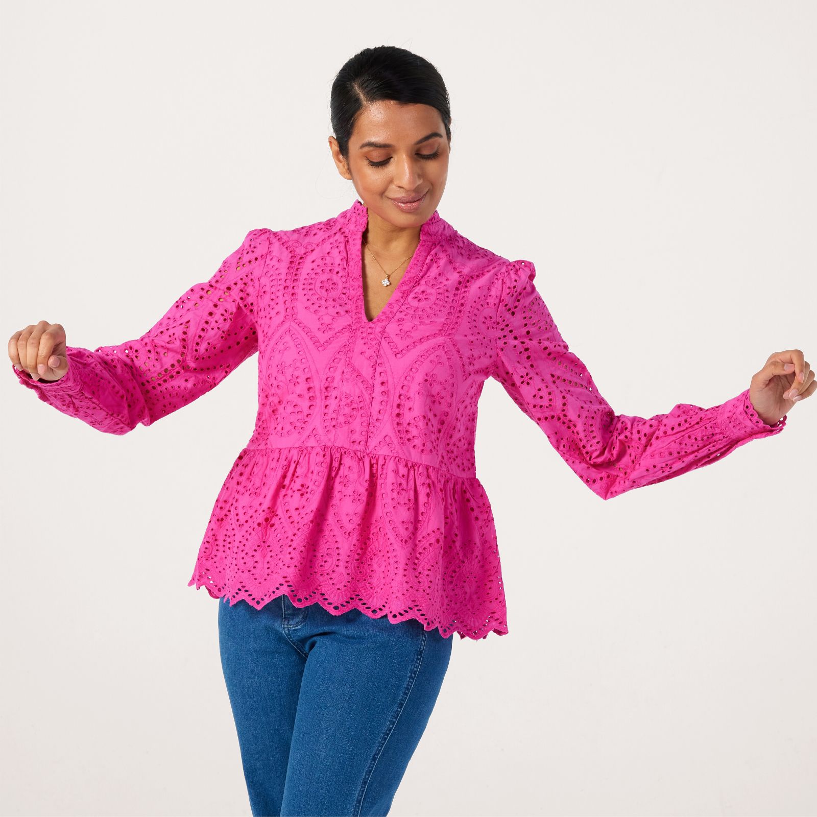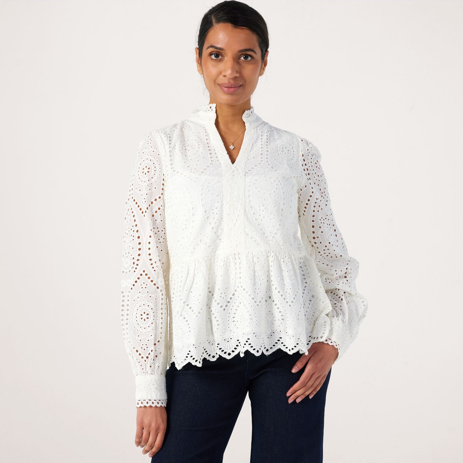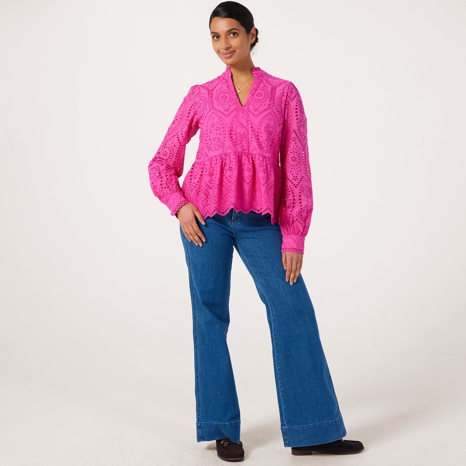 Delicate broderie detailing and a flattering waist focus bring a romantic touch to the Holi long sleeve top from YAS, while the v-neckline and pretty scalloped hem create a feminine silhouette that's effortlessly chic. Ideal for everything from brunch dates to weekend strolls, its versatile style makes it easy to dress up or down. Try pairing it with tailored trousers or a flowing midi skirt for a polished look.