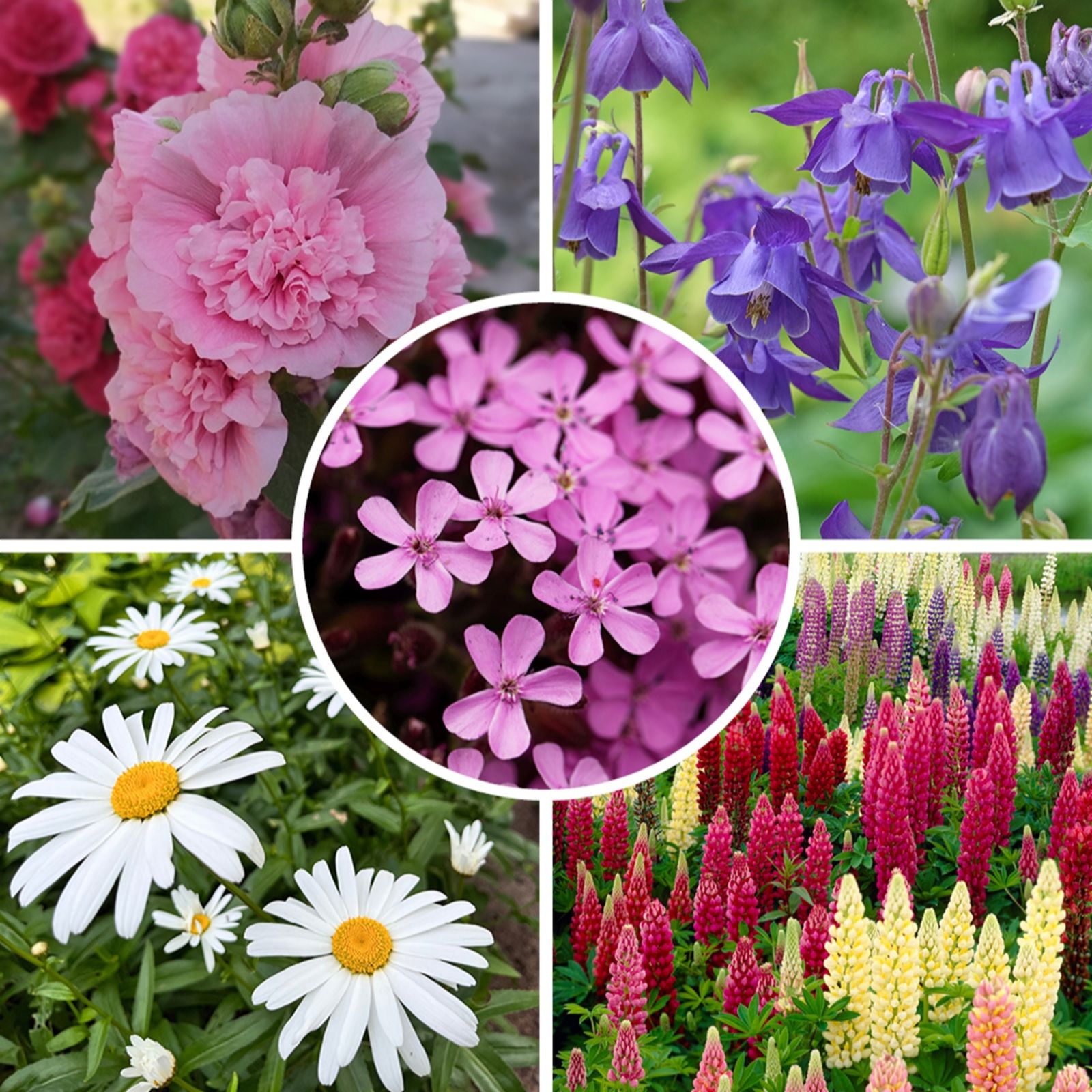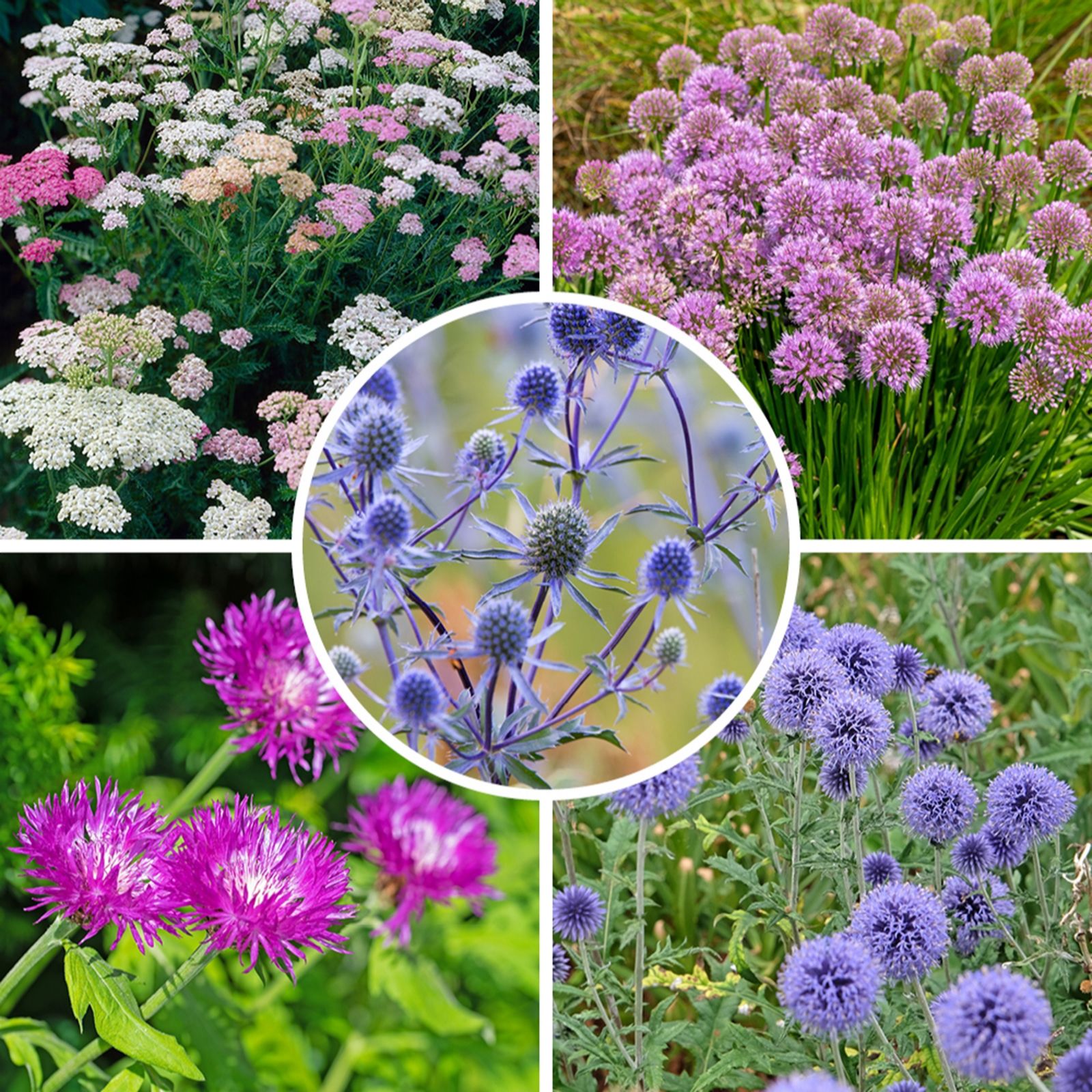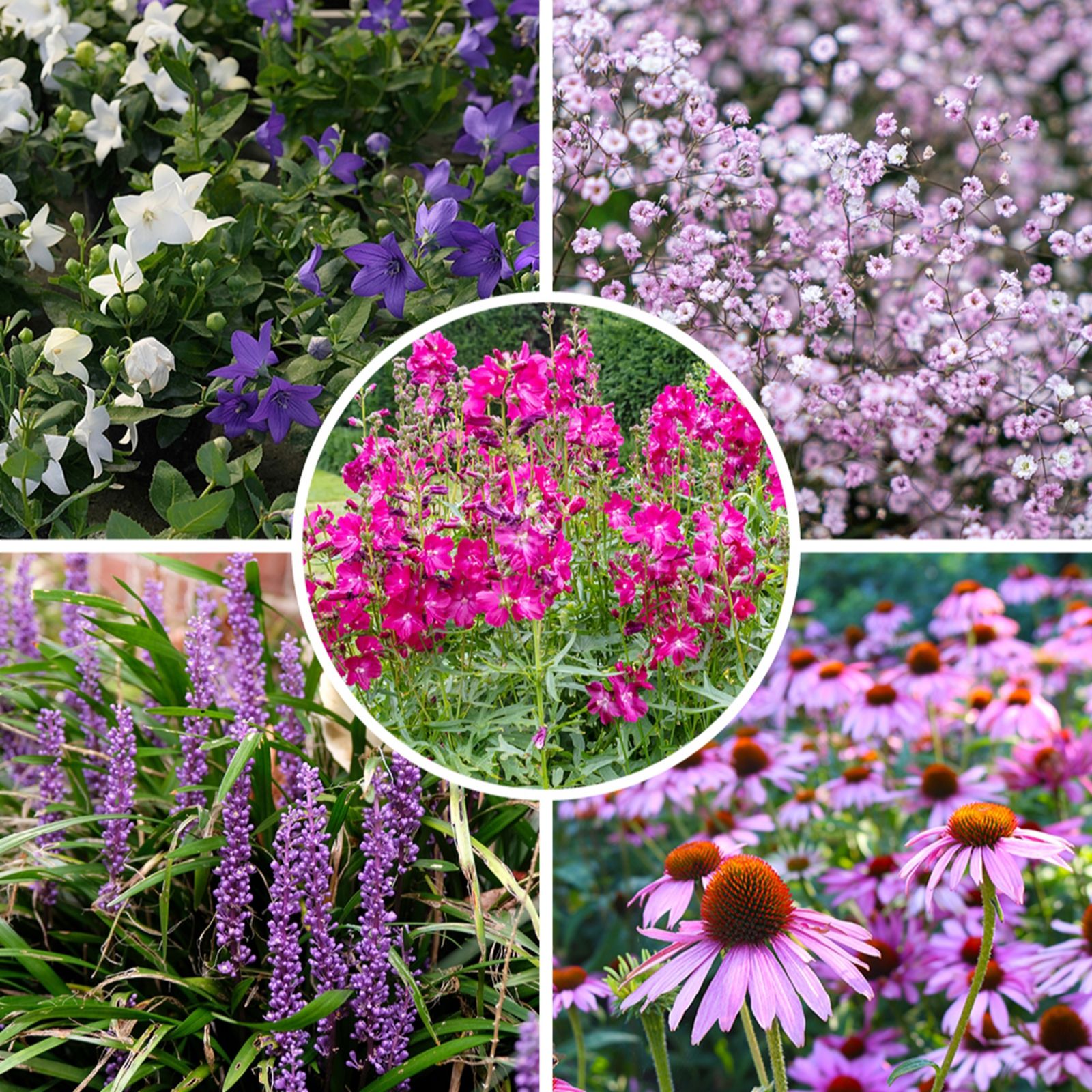 - 1 x Complete Border Bare Root Perennial Collection (Bare Roots) - with 15 varieties: Achillea Colorado Mix, Alcea Rosea Chaters, Allium Millenium, Aquilegia Alpinia, Centurea Dealbata, Chrysanthemum Alaska, Echinacea Purpurea, Echinops Ritro, Eryngium Planum, Gypsophila Pacifica, Liriope Big Blue, Lupin Russell, Platycodon Mix, Saponaria ocymoides and Sidalcea Party Girl